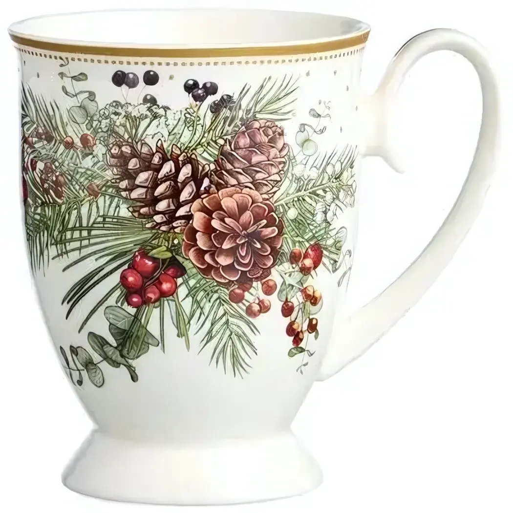 Эта кружка создаёт атмосферу особого уюта и торжества. Белоснежный фарфор тонкой работы украшен нежным зимним декором с еловыми ветками, сосновыми шишками и ягодами, а по краю проходит утончённая золотистая окантовка, придающая изделию изящество и праздничное настроение. Такой дизайн делает кружку не только функциональной, но и декоративной деталью сервировки.