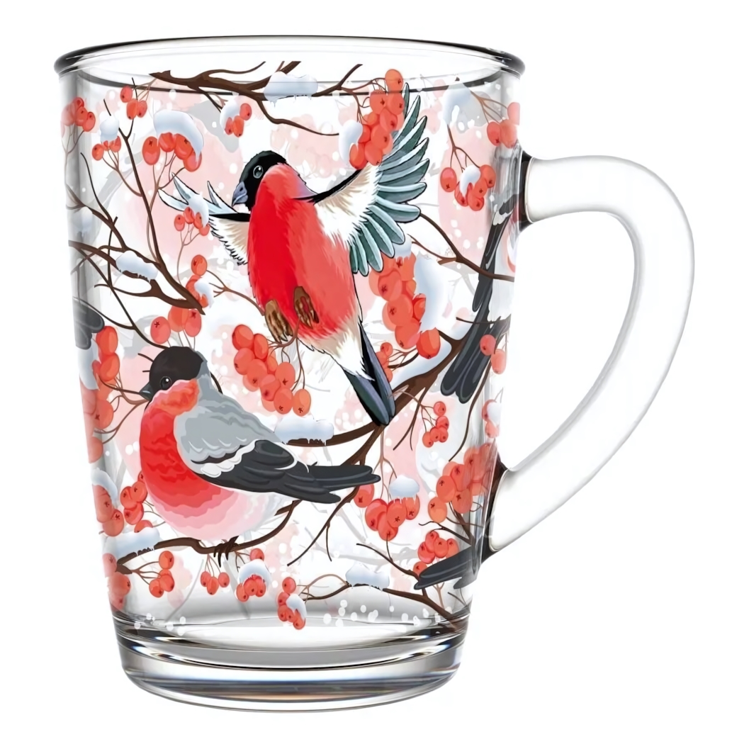 Прозрачная кружка с нежным зимним рисунком создаёт атмосферу тепла и уюта с первого взгляда. Объём 300 мл идеально подходит для чая, кофе или какао, позволяя насладиться любимым напитком дома или на работе. Яркий принт с птицами на заснеженных ветках добавляет настроения и делает каждое чаепитие особенно приятным.