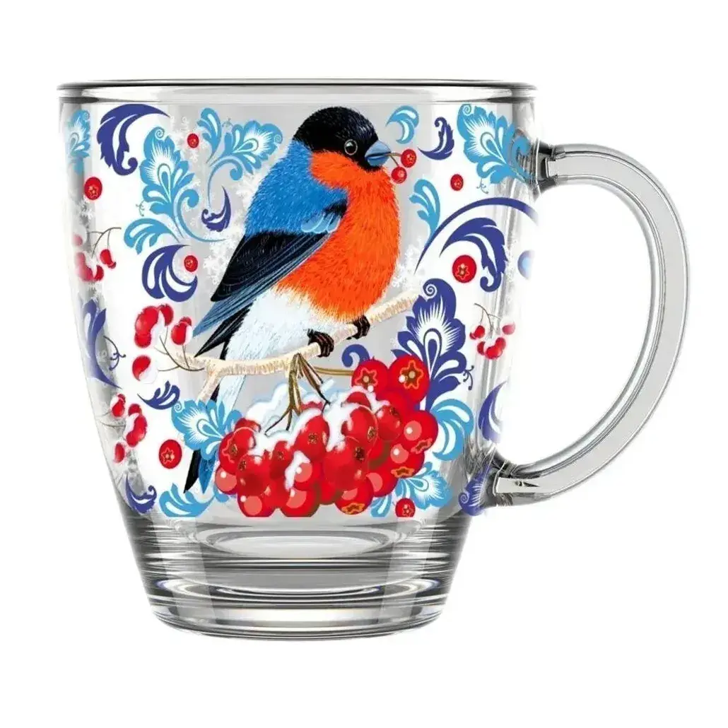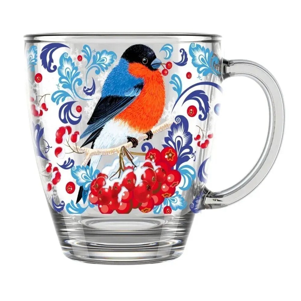Объем: 350 мл. Материал: прозрачное стекло. Декор: рисунок «Снегири на рябине» с яркими оттенками красного, синего, голубого и белого цветов. Сделайте паузу для себя с этой кружкой: она украсит кухню и подарит настроение независимо от времени года.