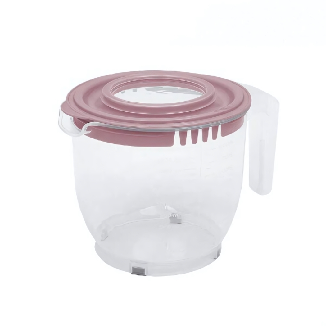 Эта прозрачная кружка объемом 2,2 литра выполнена из высококачественного пластика с пепельно-розовым оттенком, что делает процесс приготовления и замеса более удобным и эстетичным. Она отлично подходит для использования с миксерами, блендерами и другими кухонными приборами, позволяя легко мерить и перемешивать ингредиенты.