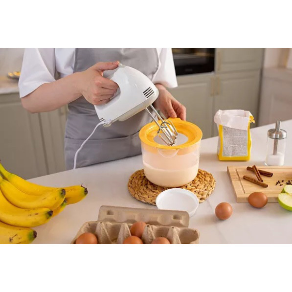 Кружка оснащена двумя крышками: одна с большим отверстием для ручного миксера, а другая — с меньшим отверстием. Это позволяет вам использовать стандартный ручной миксер без труда, а высокие стенки кружки защищают окружающее пространство от брызг. Для удобства переливания теста в форму для выпечки, кружка имеет форменный носик, который может находиться как в открытом, так и закрытом состоянии.