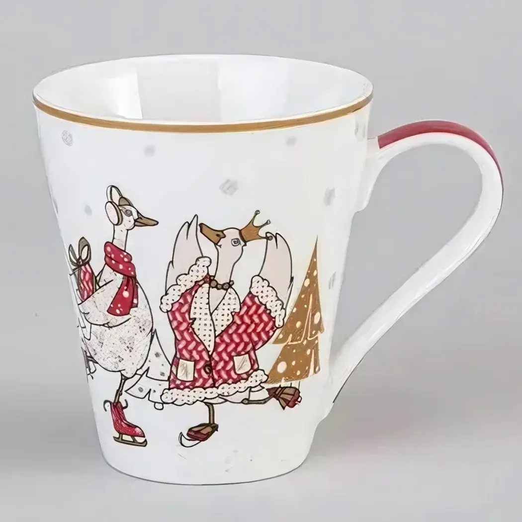 Погрузитесь в атмосферу любимых зимних праздников с кружкой, которая наполнит ваш день теплом и улыбками. Белый фарфор, декорированный забавными гусями в красных шарфах и золотистыми ёлками, создаёт ощущение домашнего уюта и радости семейных встреч. Этот дизайн станет ярким акцентом на вашем столе и подарит праздничное настроение даже в будни.