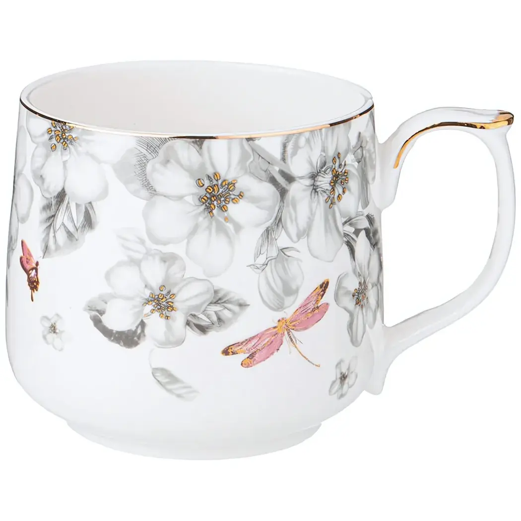 Кружка имеет округлую форму и удобную ручку, что делает её комфортной в использовании. Белый цвет с цветочным узором и золотыми деталями придаёт ей изысканный вид. Размер кружки позволяет использовать её как для чая, так и для кофе, что делает её универсальным выбором для любого любителя напитков.