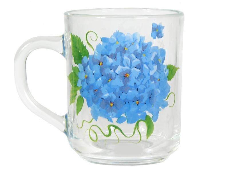 Кружка стеклянная с цветами гортензии, 200 мл, серия «8 марта», синие бутоны, ручка