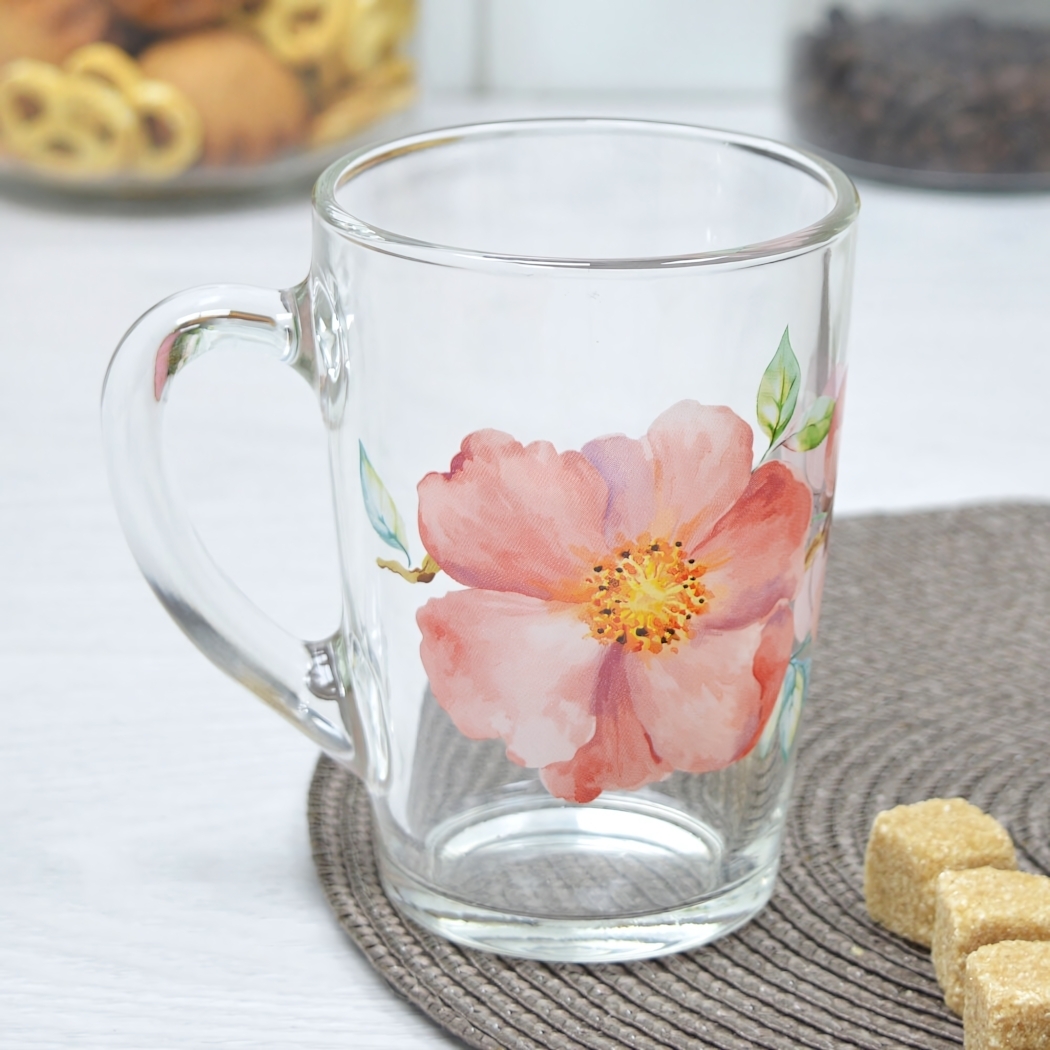 Наслаждайтесь любимыми напитками в кружке с тонким художественным оформлением. Акварельные цветы в нежных розовых и зеленых тонах создают атмосферу весеннего настроения, а прозрачное стекло подчеркивает изящество формы.