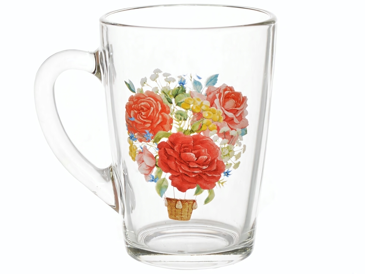 Стеклянная кружка объемом 300мл не только практична, но и эстетична. В отличие от керамики, стекло не впитывает запахи и позволяет контролировать количество напитка. Цветочный декор с красными розами добавляет изысканности в повседневность.