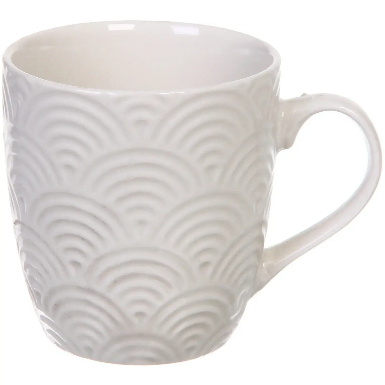 Эта кружка из прочной керамики станет стильным и практичным элементом вашей кухни. Белый цвет и изящный рельефный узор придают ей элегантный вид, который легко сочетается с любой сервировкой стола. Благодаря удачной форме с небольшим сужением к основанию, кружка удобно лежит в руке, а плавно изогнутая ручка облегчает хват и делает процесс питья комфортным.
