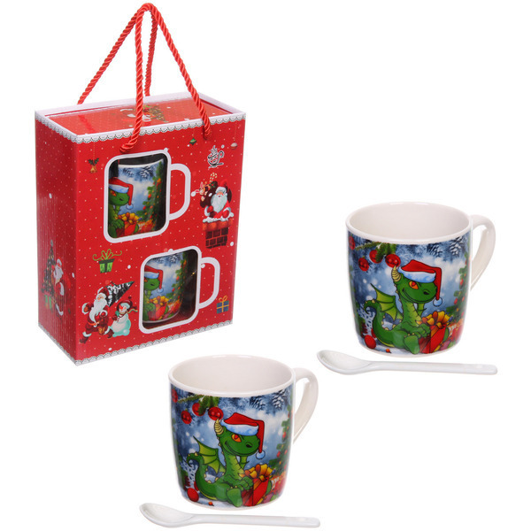 Кружки имеют стандартную округлую форму с удобной ручкой, что делает их идеальными для повседневного использования. В комплекте идут две маленькие ложки, которые удобно хранить вместе с кружками. Набор отлично подходит как для личного использования, так и в качестве подарка на Новый год или Рождество.