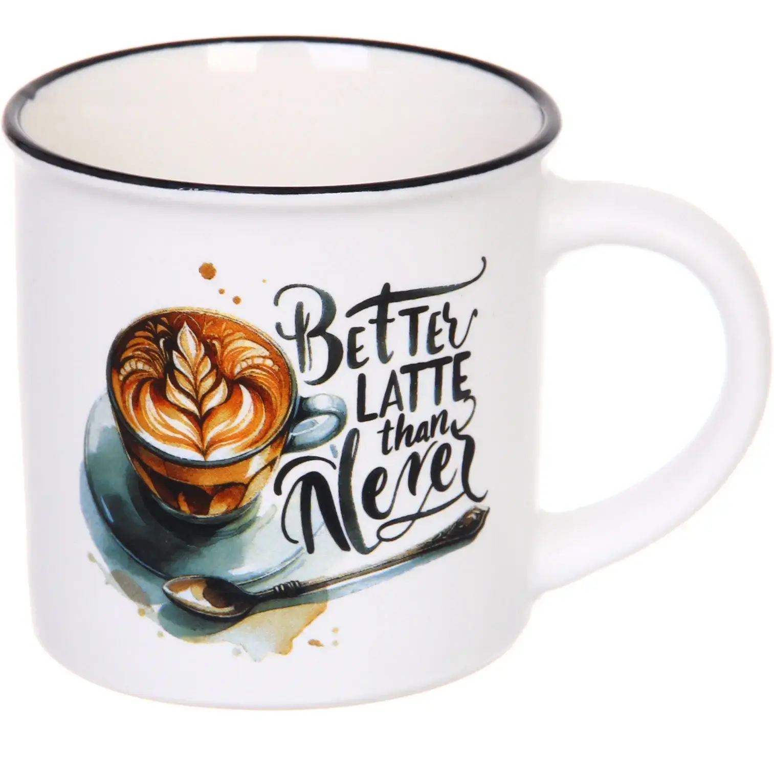 - «Better latte than never» — стилизованное изображение кофейного напитка