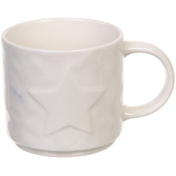 Материал: керамика. Цвет: белый. Объем: 270 мл. Форма – округлая или цилиндрическая с закруглённым верхом и дном, в зависимости от партии. Ручка белого цвета, надежно крепится к корпусу чашки. Рельефная поверхность украшена уникальным символом — звездой, делающим каждое чаепитие особенным.