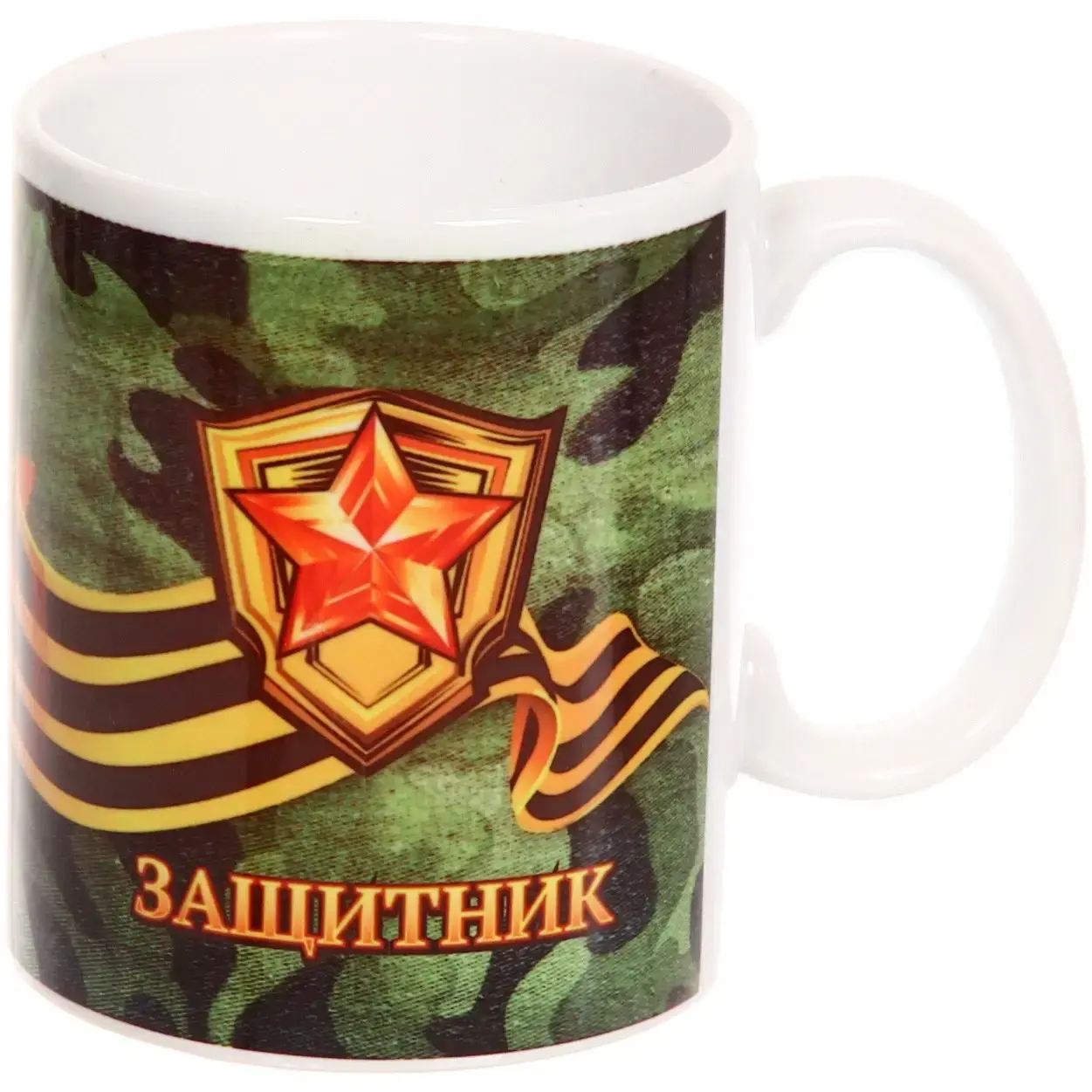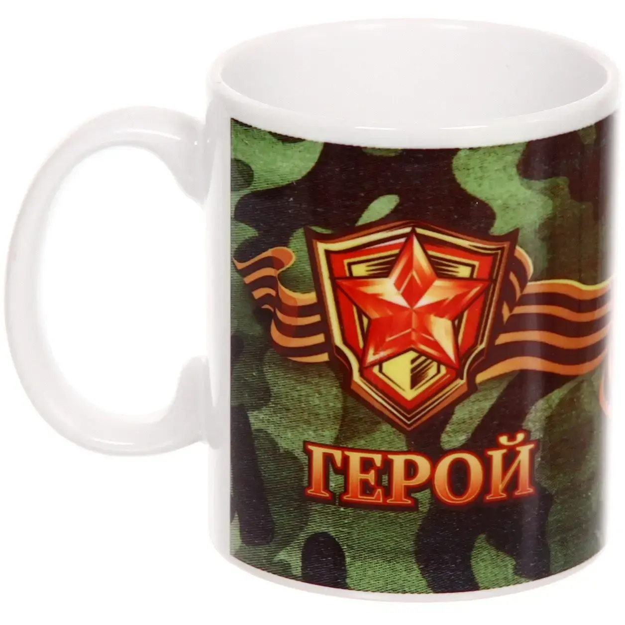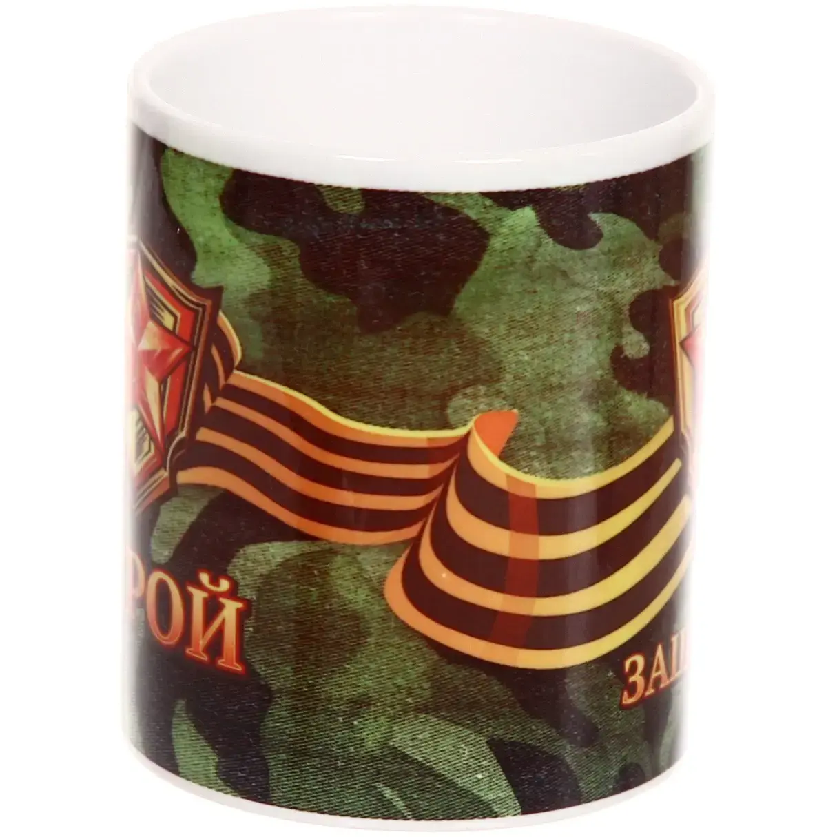 Кружка имеет стандартную цилиндрическую форму и белый цвет внутри, что делает ее универсальной для любого интерьера. Внешняя поверхность украшена камуфляжным узором в зеленых и черных тонах, а также яркими элементами дизайна, такими как красная звезда и георгиевская лента. Размеры кружки соответствуют стандартам, что делает ее удобной для использования в любых условиях.