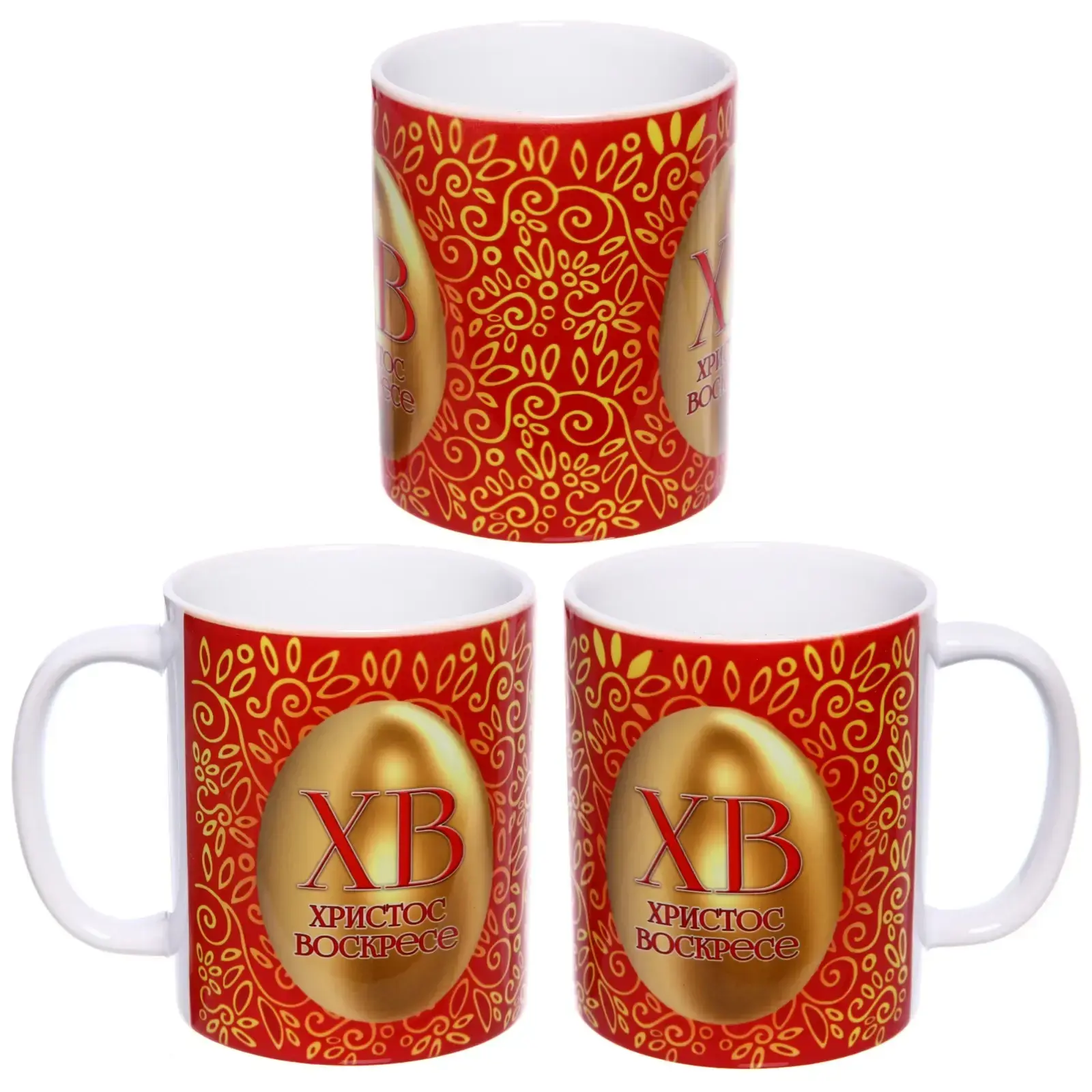 Кружка имеет стандартный размер и выполнена в красном цвете с золотыми элементами. Внутренняя часть кружки белая, что создает контраст с ярким внешним оформлением. Дизайн кружки включает надписи «ХВ» и «Христос воскресе», что делает ее особенно актуальной в пасхальный период.