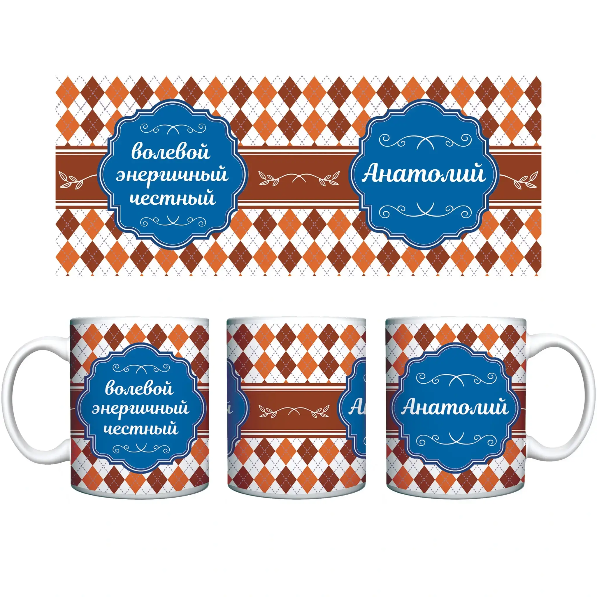 Кружка керамическая 330мл, дизайн "Анатолий", белая с оранжевым узором