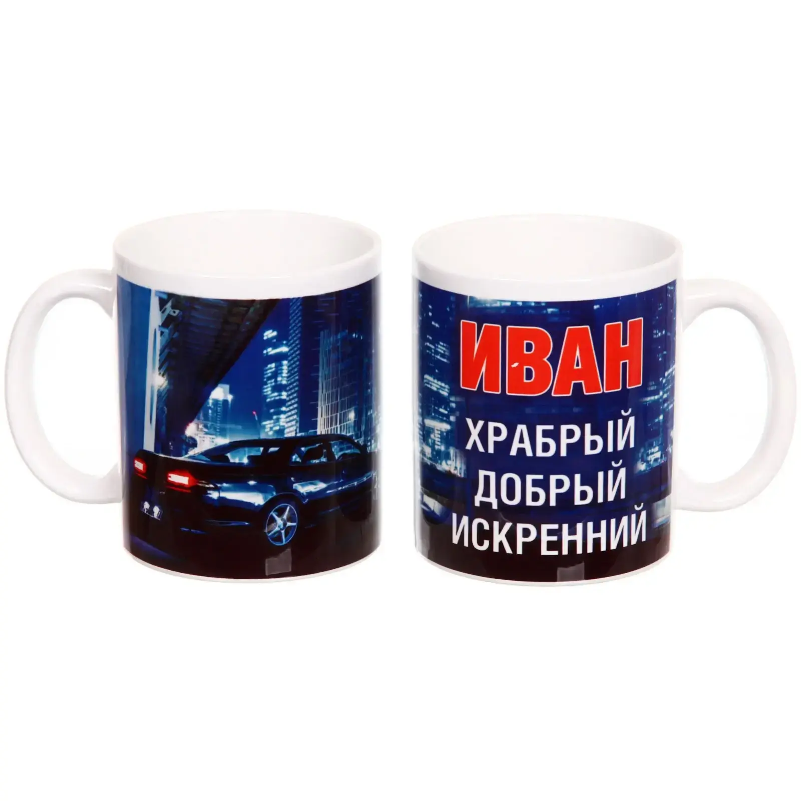 Выбор этой кружки – это не только практичность, но и стильный дизайн. На одной стороне кружки изображен черный автомобиль на фоне ночного города, а с другой – вдохновляющие слова: 'ИВАН ХРАБРЫЙ ДОБРЫЙ ИСКРЕННИЙ'. Такой уникальный дизайн делает кружку отличным подарком для мужчин, особенно для тех, кто ценит стиль и индивидуальность.