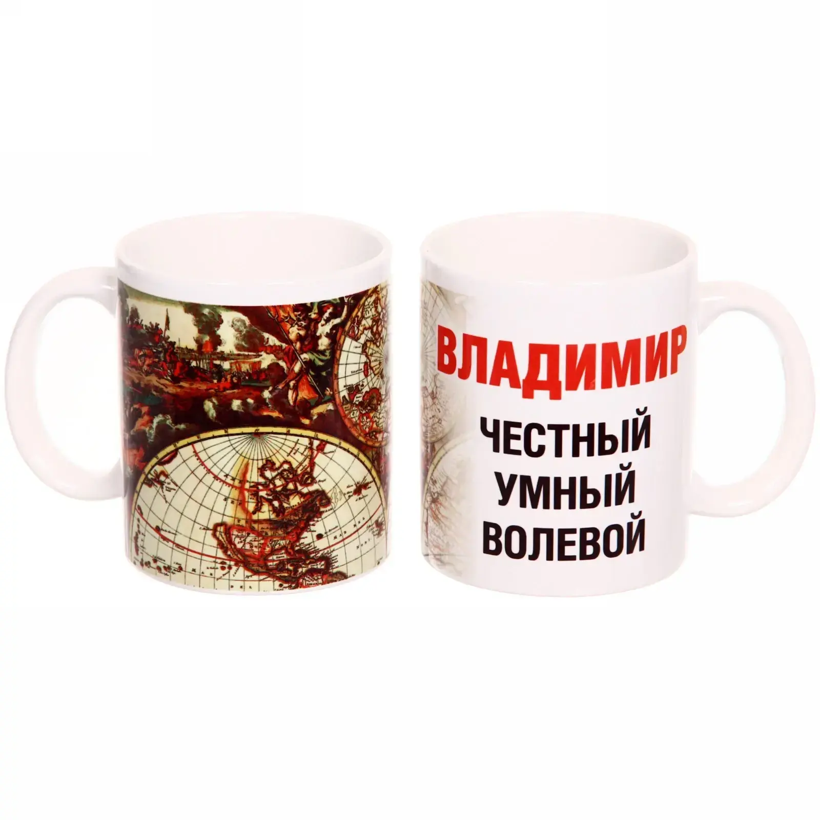 Кружка выполнена в белом цвете и украшена изображением старинных карт и текстом 'ВЛАДИМИР ЧЕСТНЫЙ УМНЫЙ ВОЛЕВОЙ'. Текст выполнен крупным шрифтом, что делает его хорошо читаемым. Ручка кружки имеет стандартную форму, что обеспечивает удобство при использовании. Эта кружка станет отличным подарком для друзей и близких, а также стильным дополнением к вашей кухонной посуде.