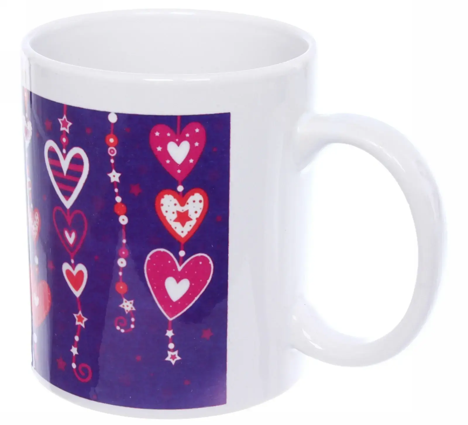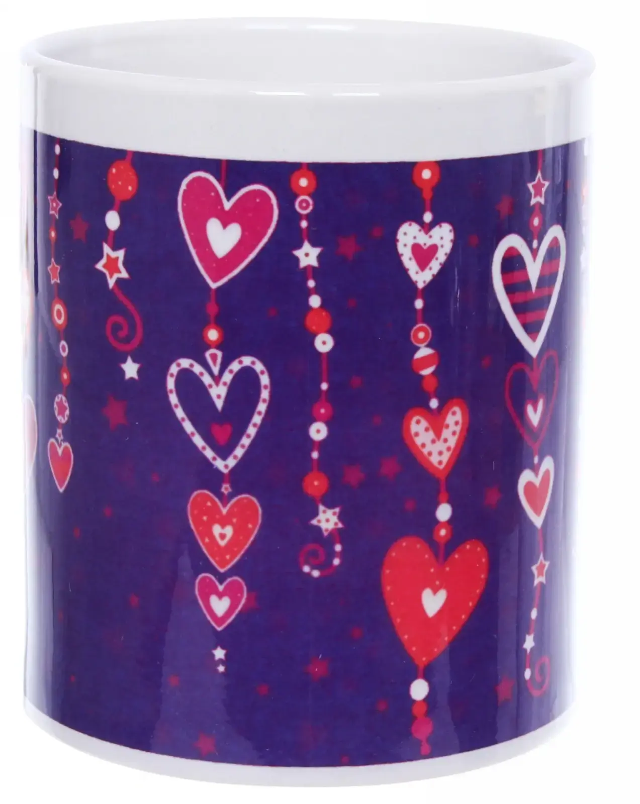 Романтичный принт с разноцветными сердечками и звёздочками создан для тех, кто ценит уютные мелочи. Сочетание розовых, красных и белых элементов на тёмном фоне делает кружку универсальным аксессуаром — она одинаково гармонично впишется в кухонный интерьер и станет тематическим дополнением для свиданий.