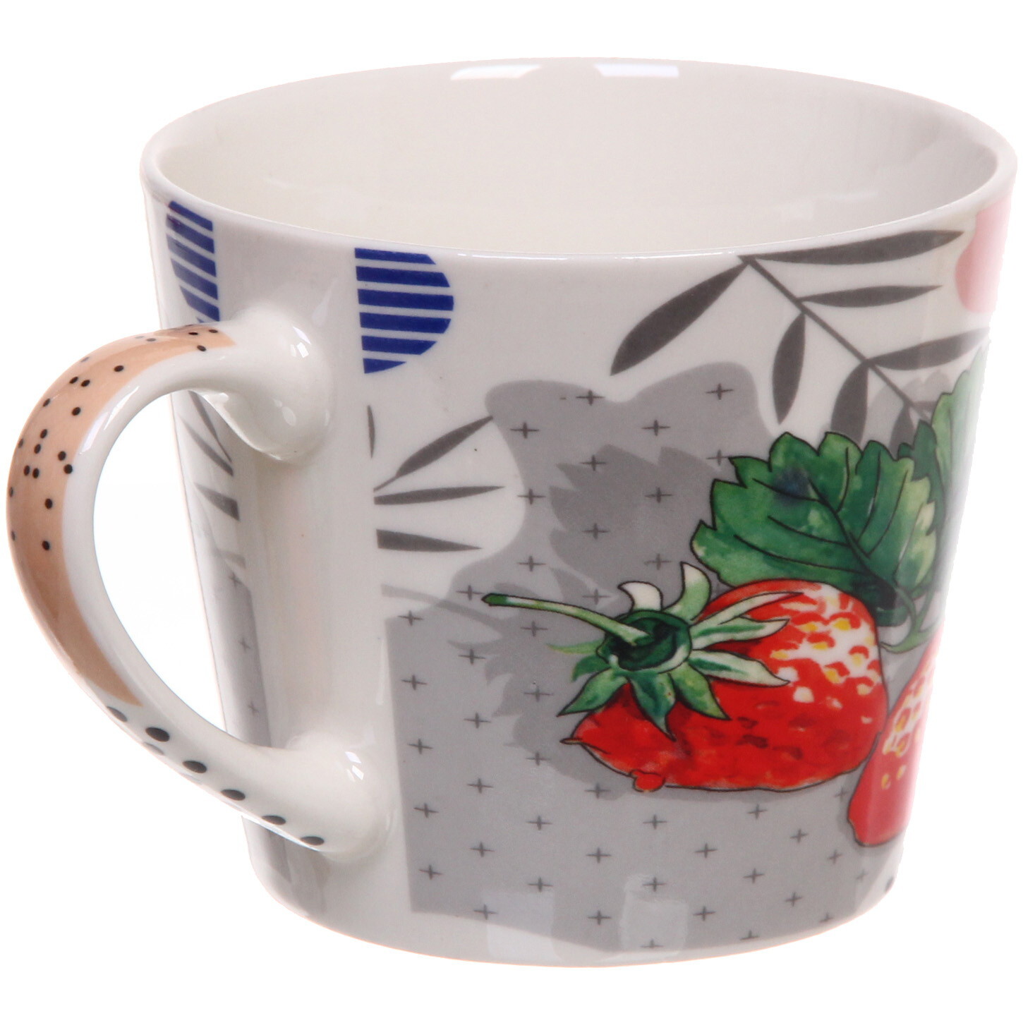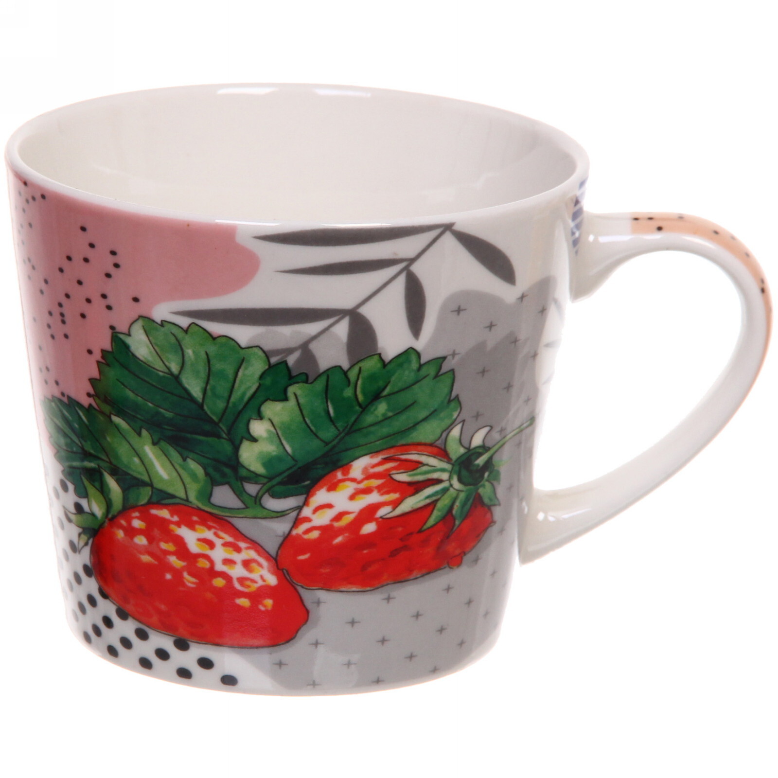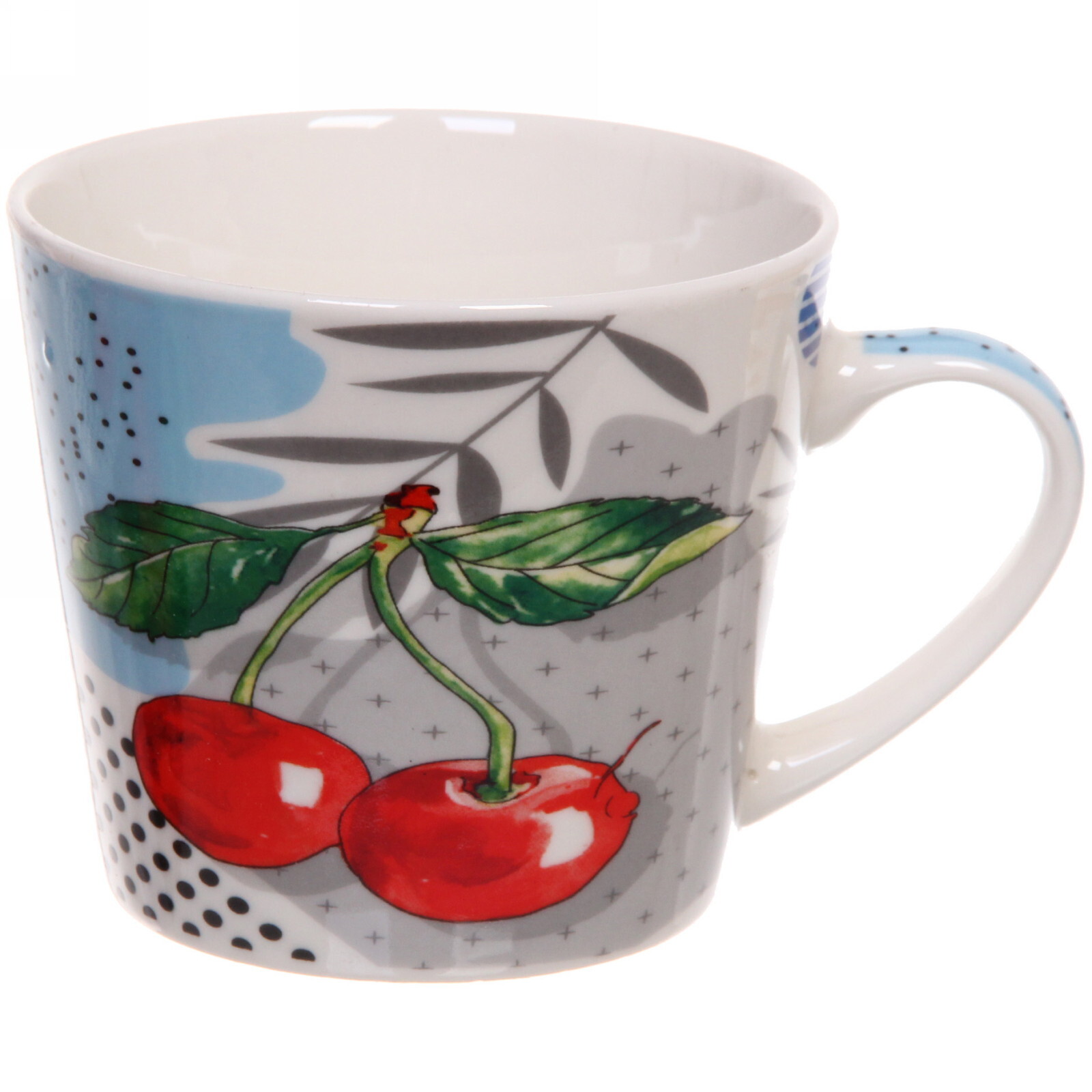 Кружка выполнена из прочной белой керамики, украшена яркими рисунками клубники и вишен. Размеры приближаются к стандартной глубине и диаметру, позволяя удобно держать и наполнять напитком. Вес и габариты оптимальны для комфортного использования и хранения.