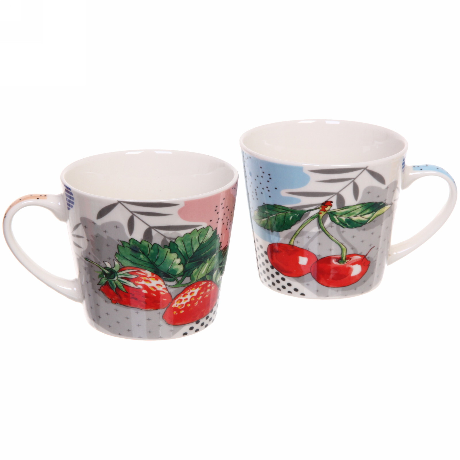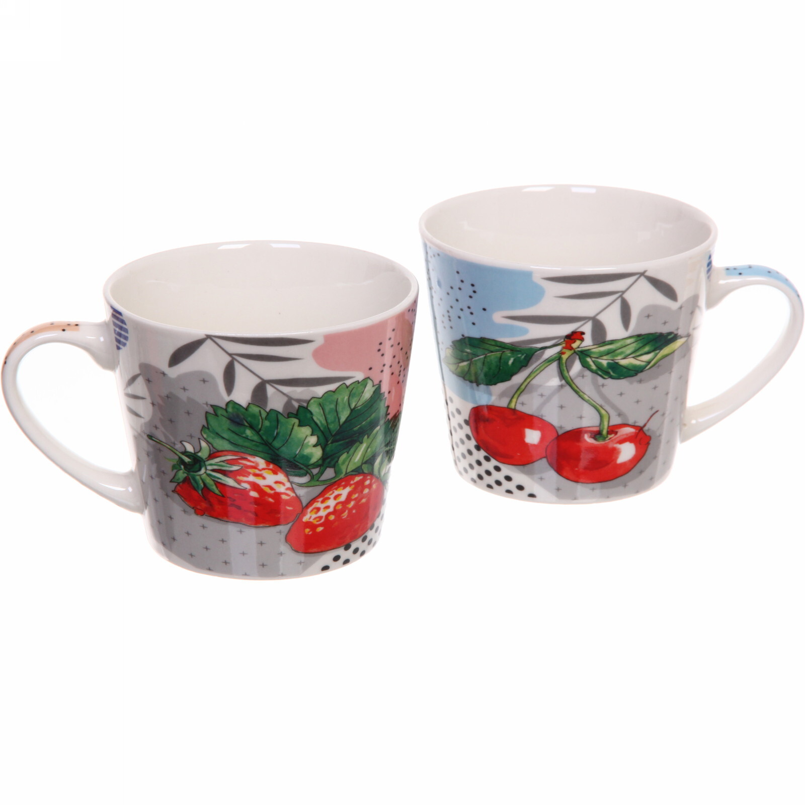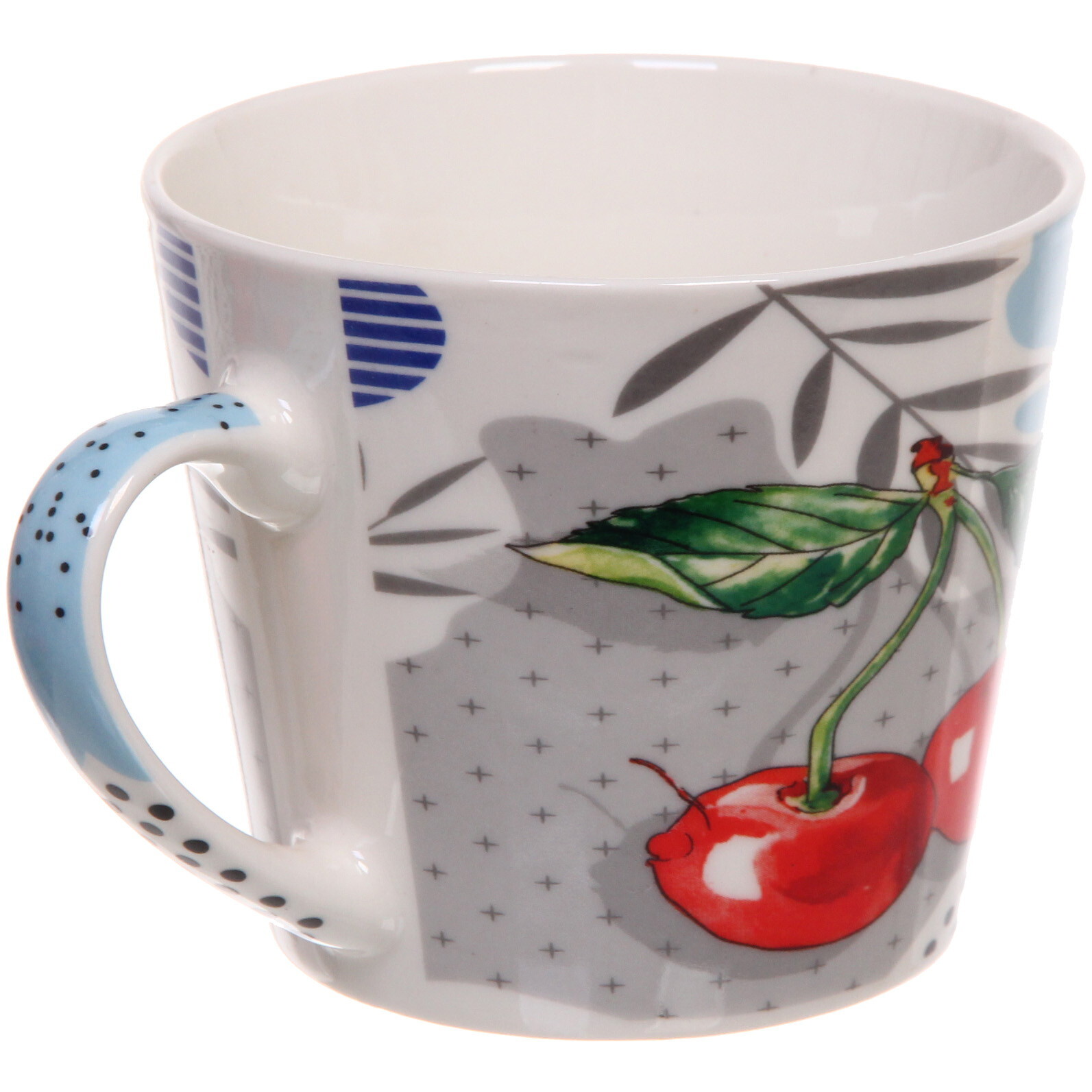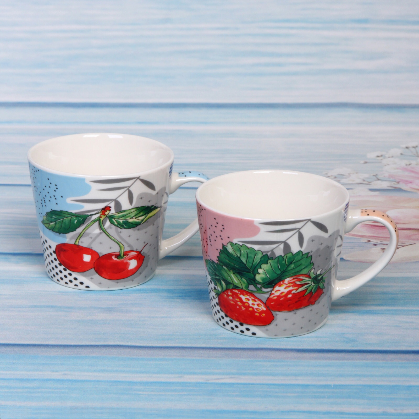 Кружка выполнена из прочной белой керамики, украшена яркими рисунками клубники и вишен. Размеры приближаются к стандартной глубине и диаметру, позволяя удобно держать и наполнять напитком. Вес и габариты оптимальны для комфортного использования и хранения.