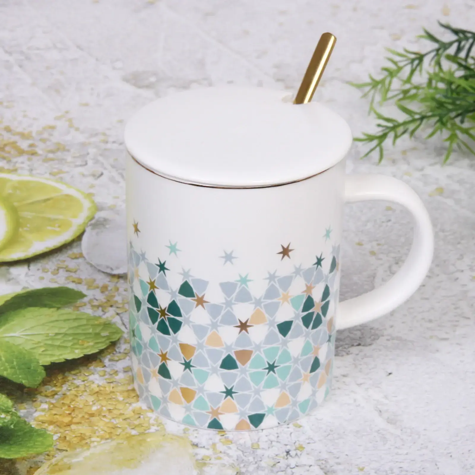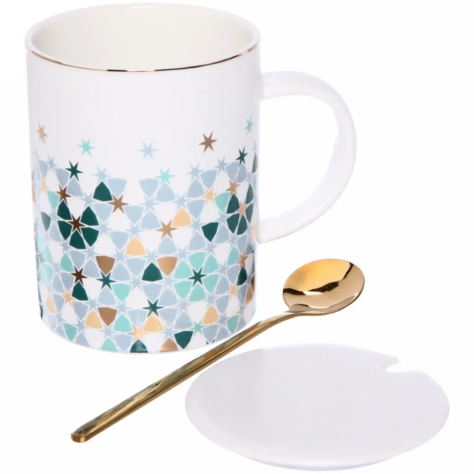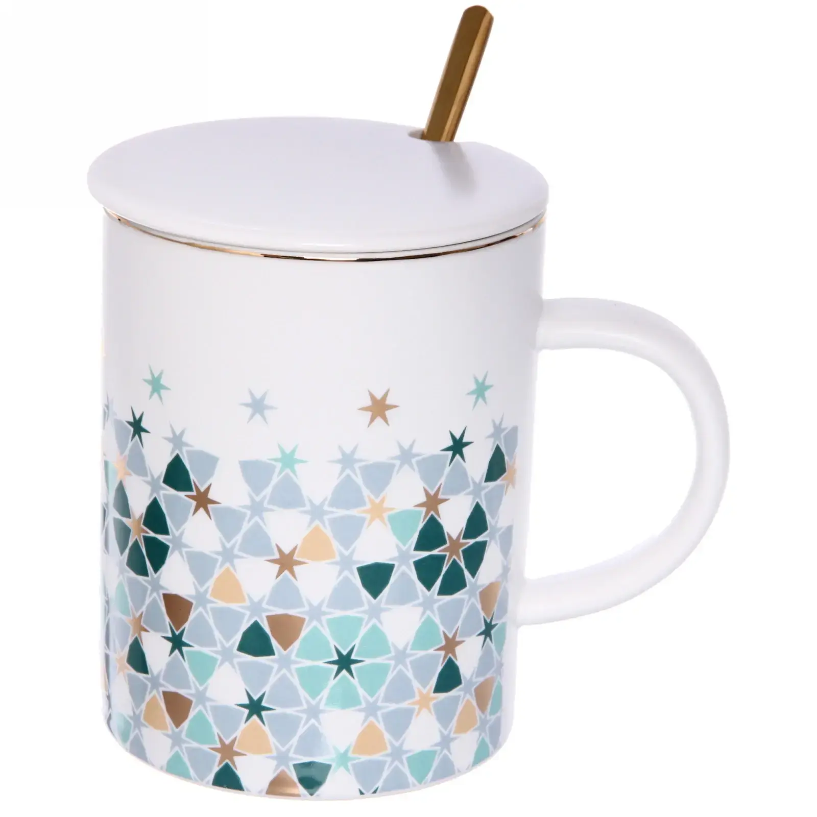 Эта стильная керамическая кружка объемом 350 мл с крышкой и ложкой станет незаменимым аксессуаром для вашего дома. Благодаря современному дизайну и яркому узору из разноцветных звезд и треугольников, она не только украсит ваш стол, но и подарит комфорт при использовании. Кружка идеально подходит для горячих и холодных напитков, а ее крышка поможет сохранить тепло и защитить от пыли.