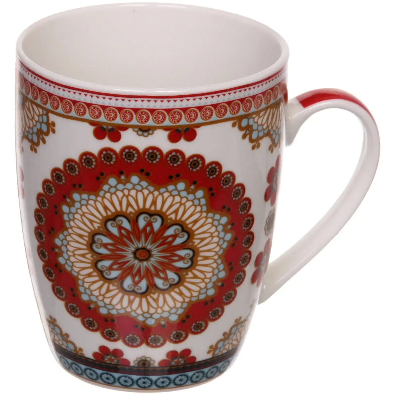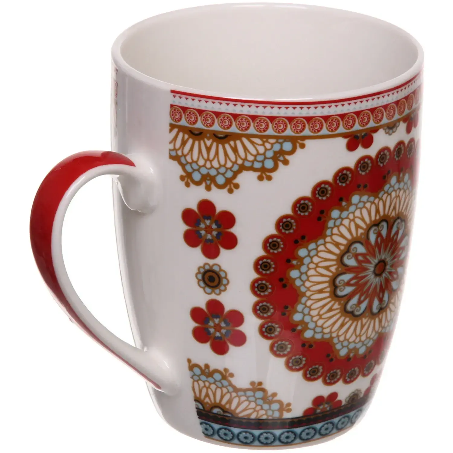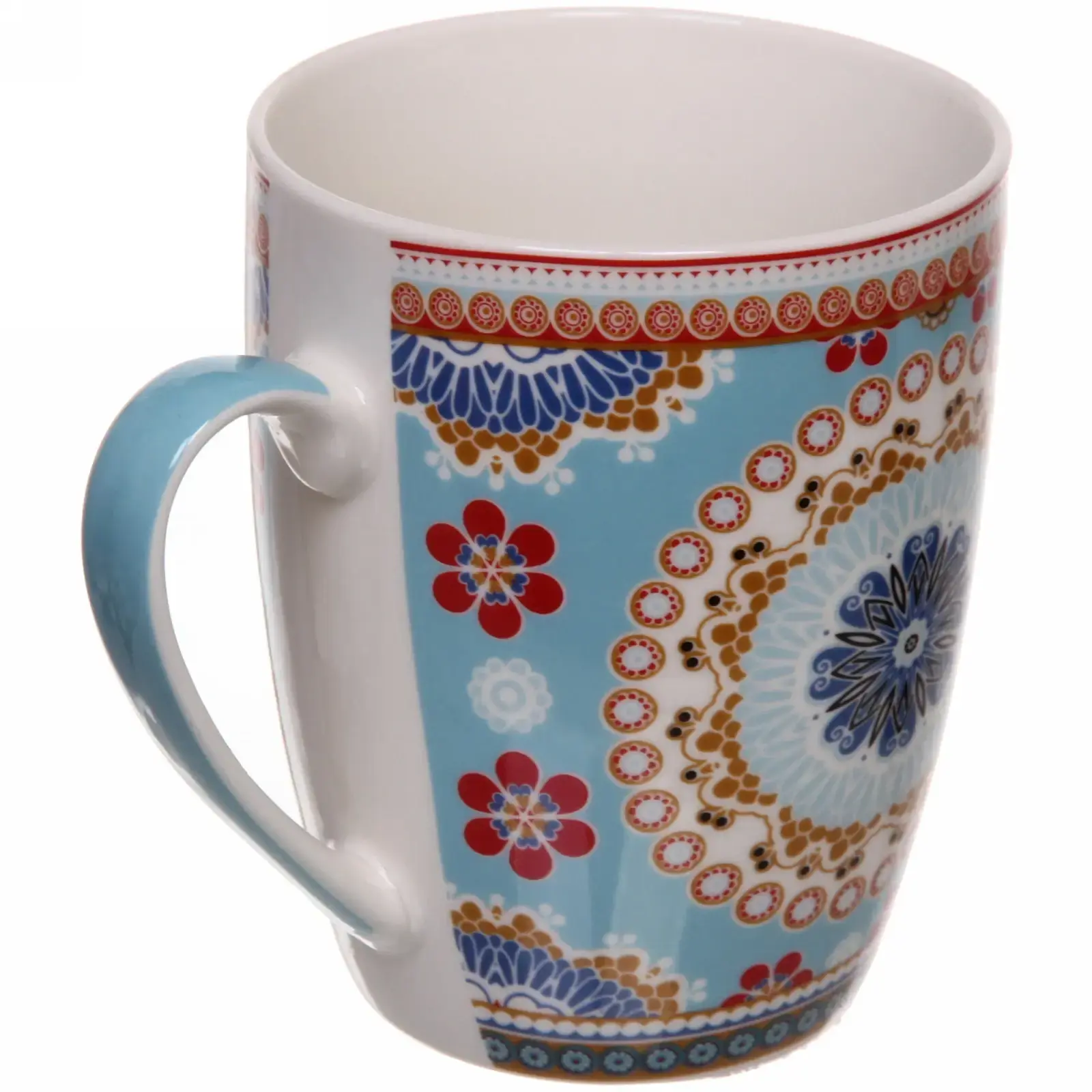 Кружка имеет цилиндрическую форму и доступна в нескольких цветах, включая красный, синий, голубой и белый. Каждый узор включает цветочные и геометрические мотивы, что делает каждую кружку уникальной. Внутренняя часть кружки выполнена в однотонном белом цвете, что создает контраст с ярким внешним декором.