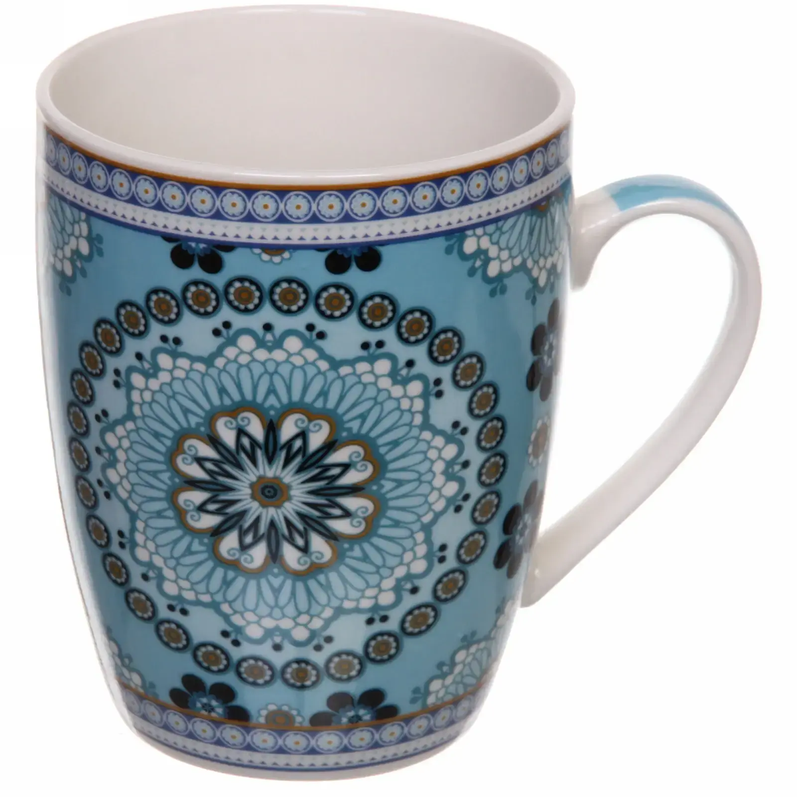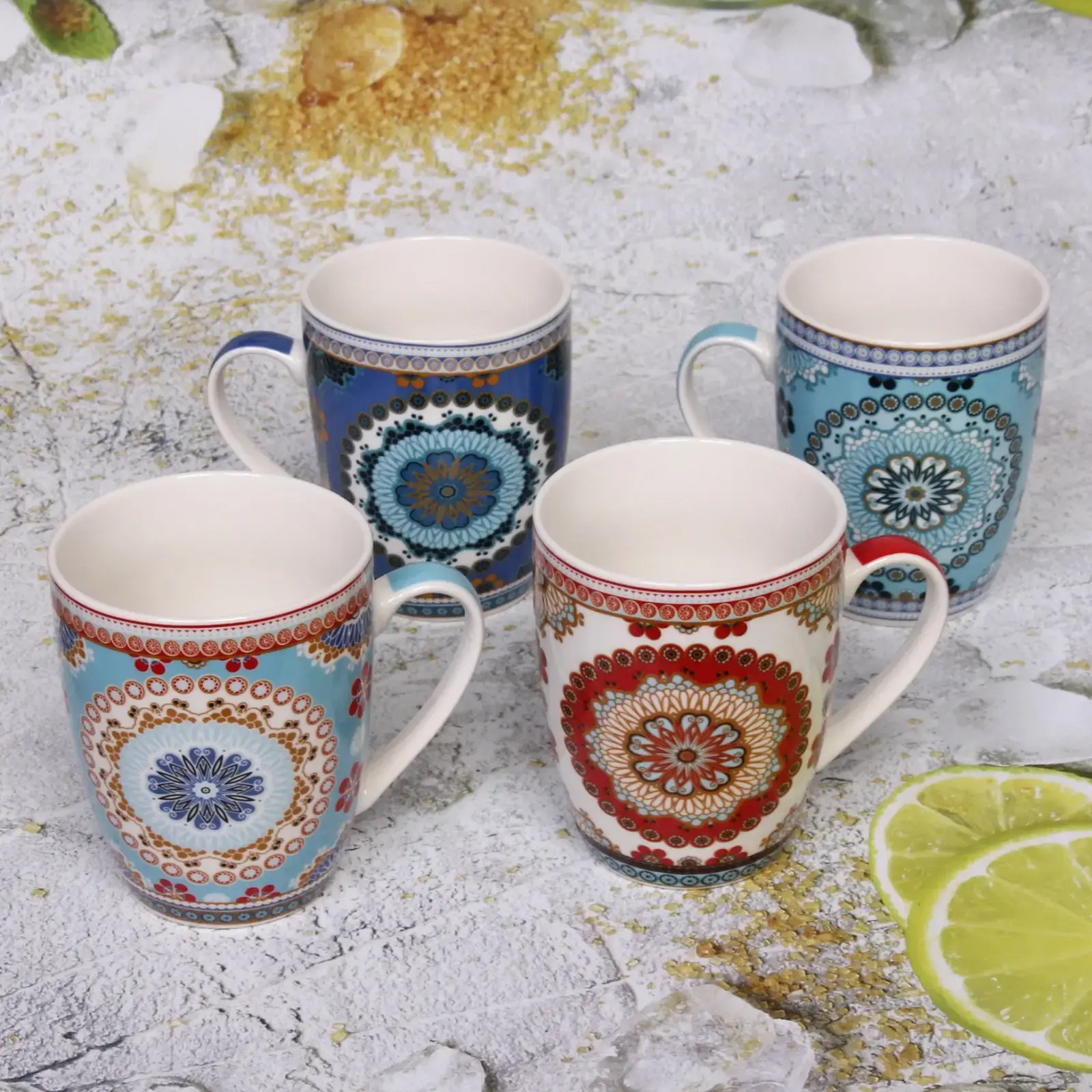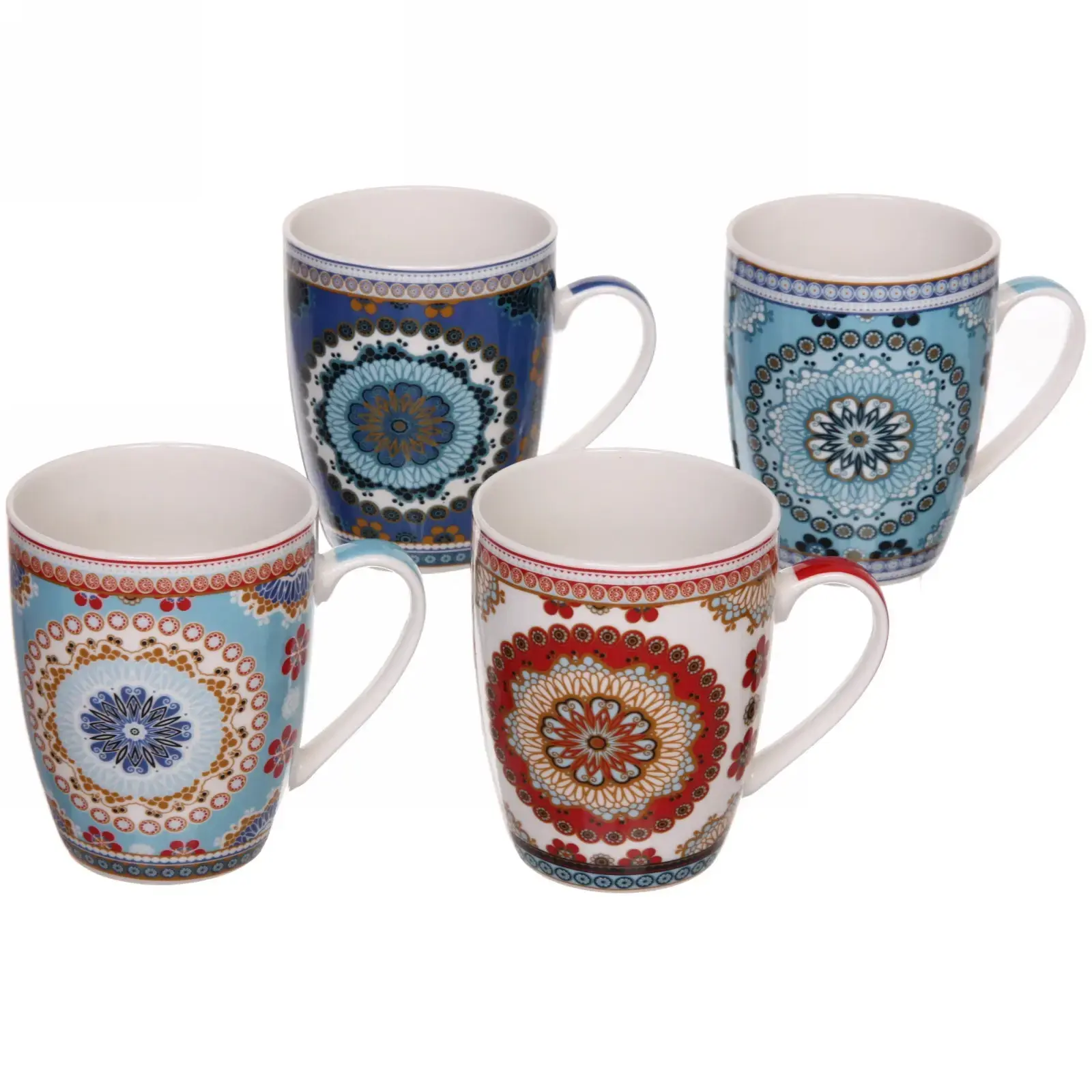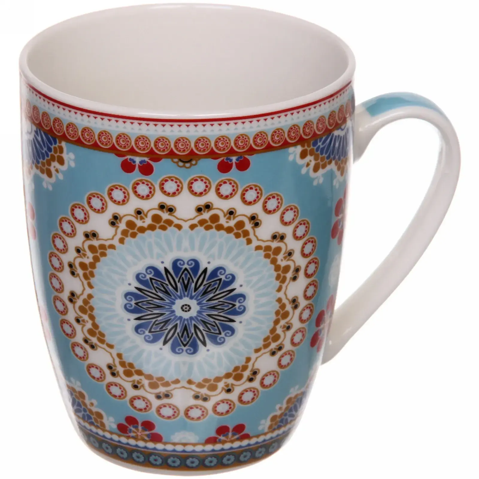 Кружка имеет цилиндрическую форму и доступна в нескольких цветах, включая красный, синий, голубой и белый. Каждый узор включает цветочные и геометрические мотивы, что делает каждую кружку уникальной. Внутренняя часть кружки выполнена в однотонном белом цвете, что создает контраст с ярким внешним декором.