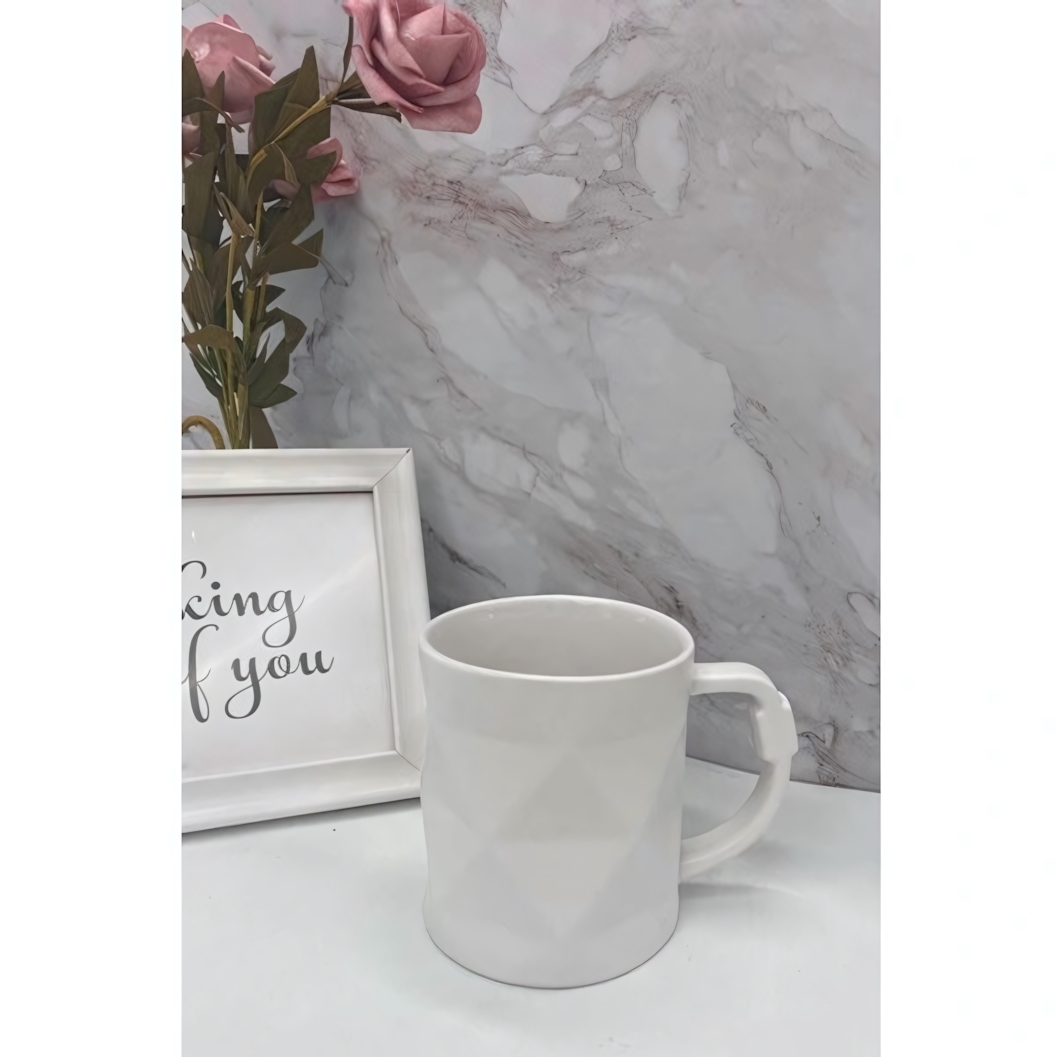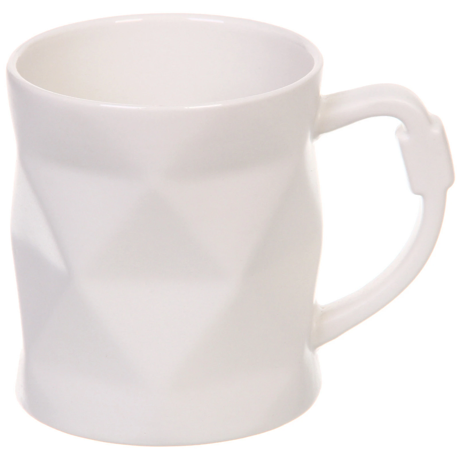 Кружка имеет высоту около 10-12 см и выполнена в белом цвете с матовой поверхностью. Рельефный узор в виде ромбов добавляет уникальности и стиля. Эта кружка станет отличным подарком для друзей и близких, а также прекрасным дополнением к вашей кухонной посуде.