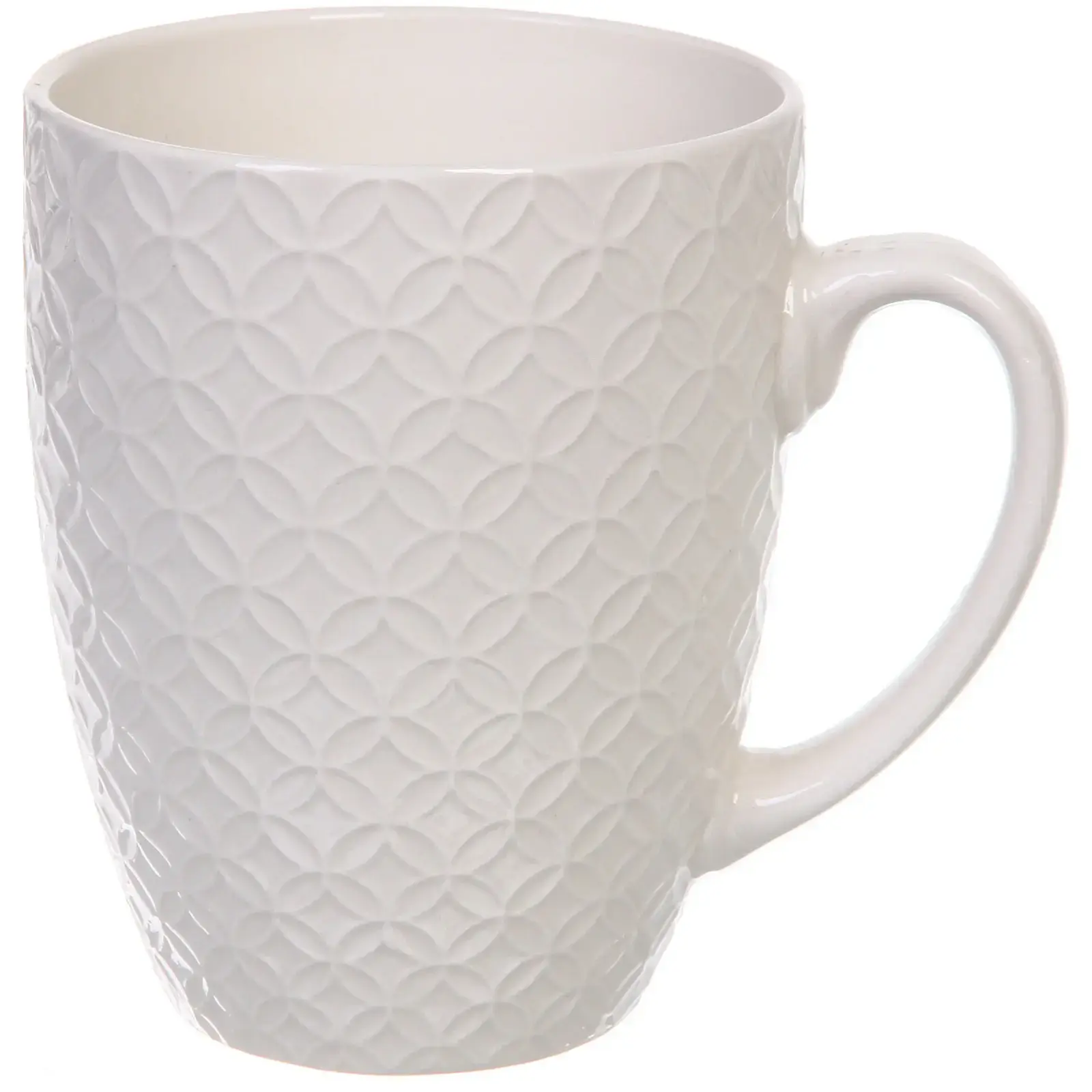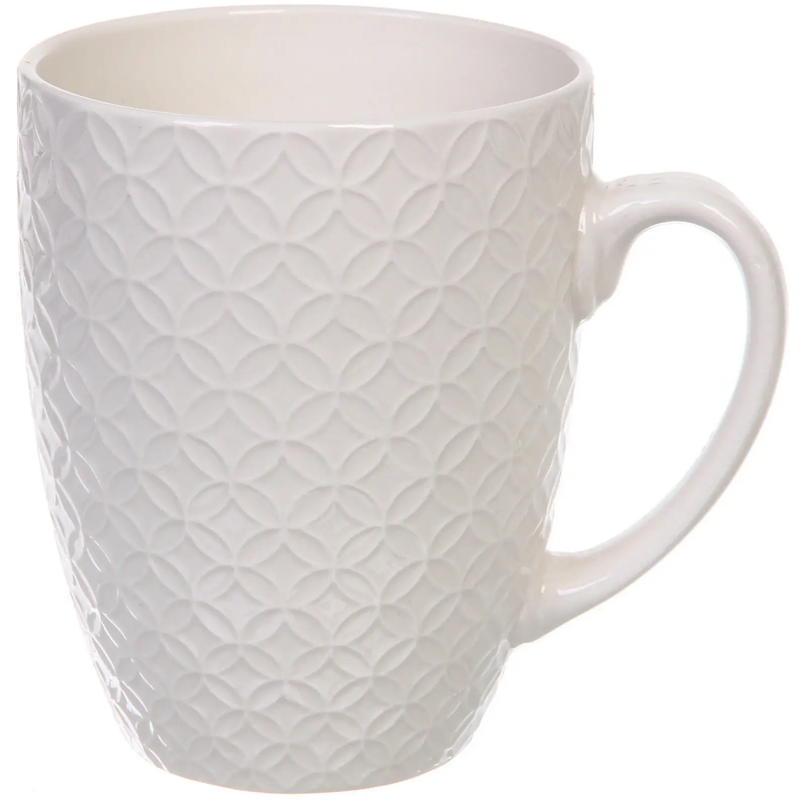 Эта кружка создана для тех, кто ценит эстетику и комфорт в повседневных мелочах. Белая поверхность с утончённым рельефным орнаментом в виде ромбов придаёт изделию изысканный вид, позволяя ему гармонично вписаться в любой интерьер кухни или офиса. Удобная форма с плавным сужением книзу обеспечивает комфортный захват, а стандартный объём 450 мл подходит как для горячих, так и для холодных напитков.
