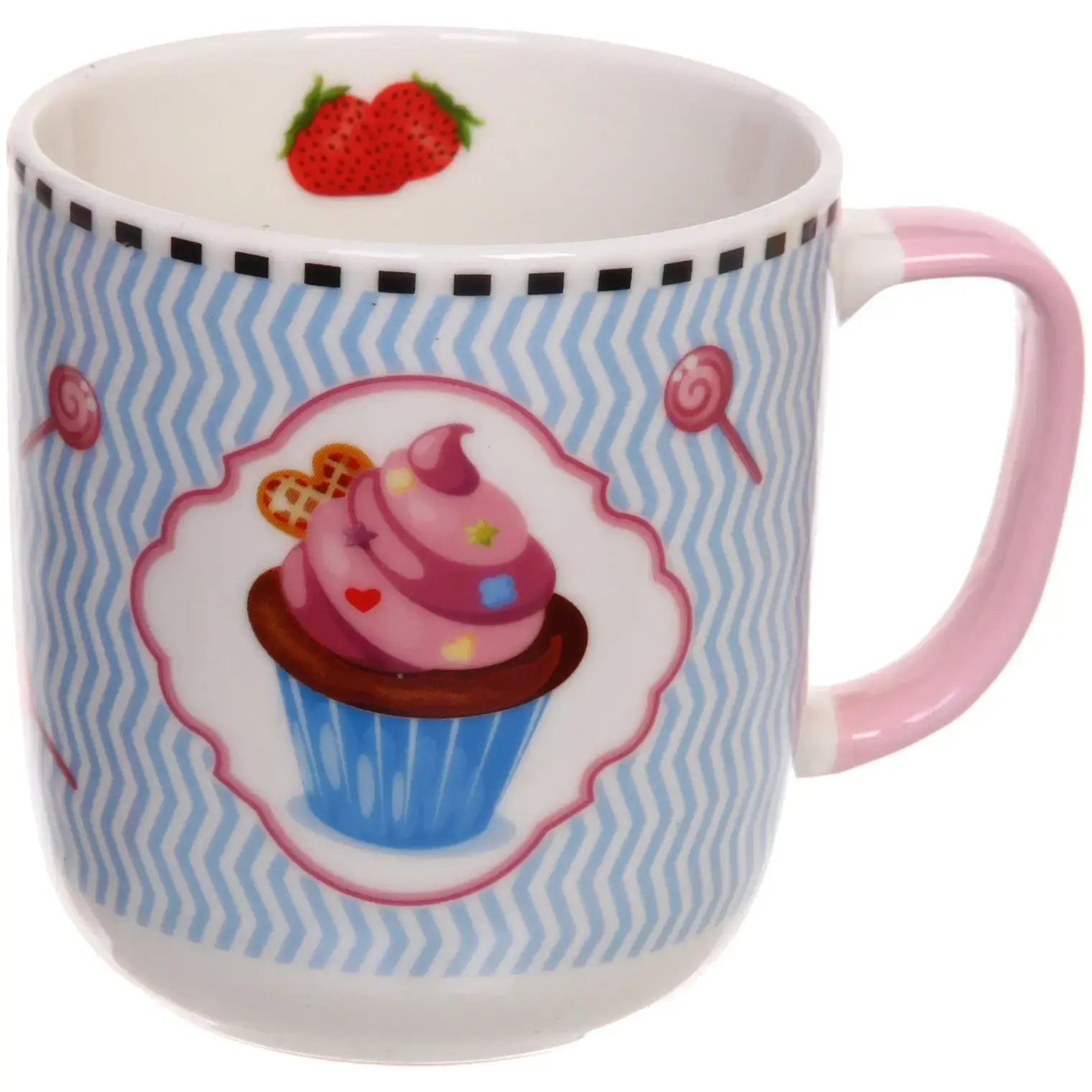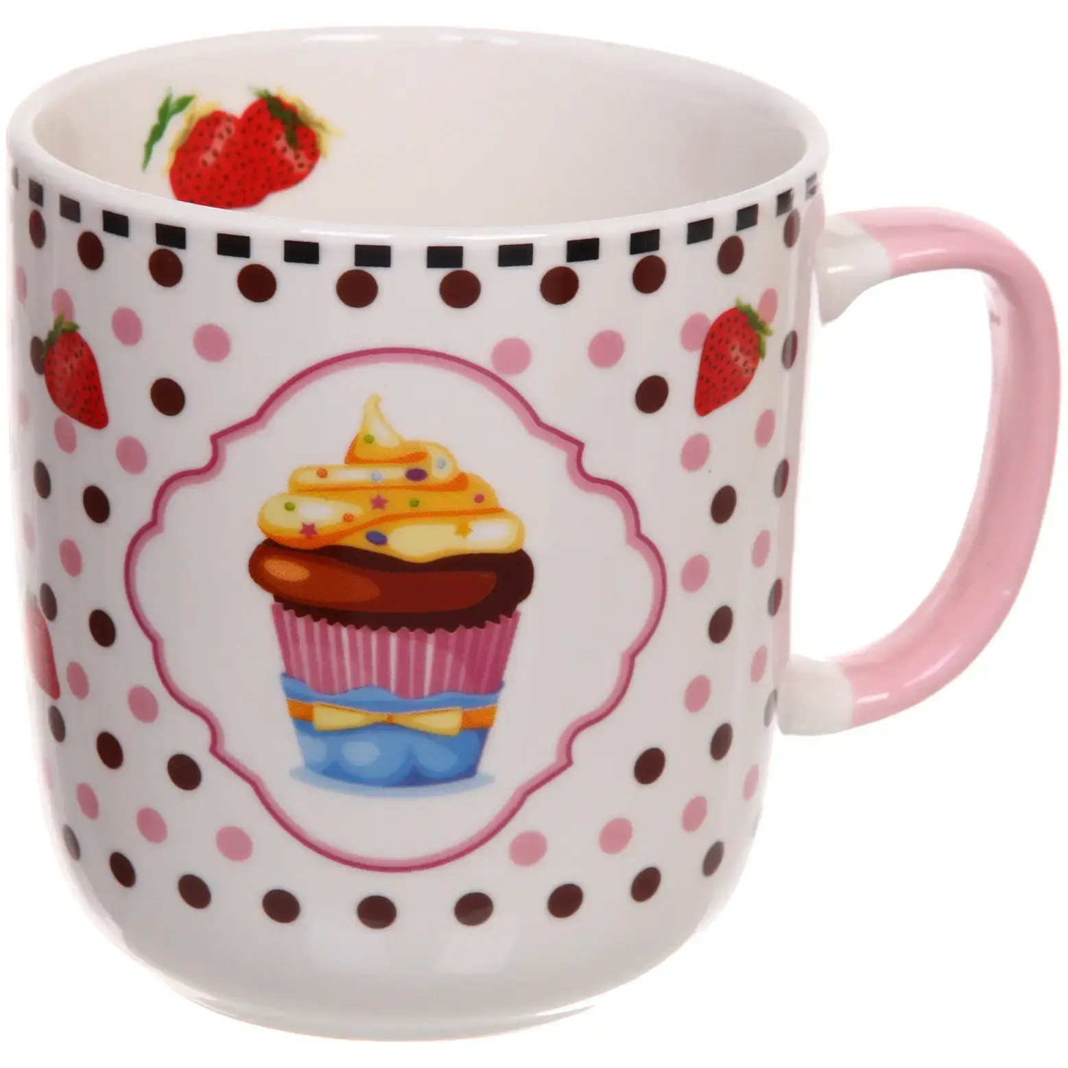 Кружка выполнена из керамики, что гарантирует ее прочность и устойчивость к высоким температурам. Декор кружки включает изображения капкейков и клубники, что делает ее не только функциональной, но и стильной. Размер кружки стандартный, что позволяет использовать ее в любых условиях — дома, на даче или в офисе.