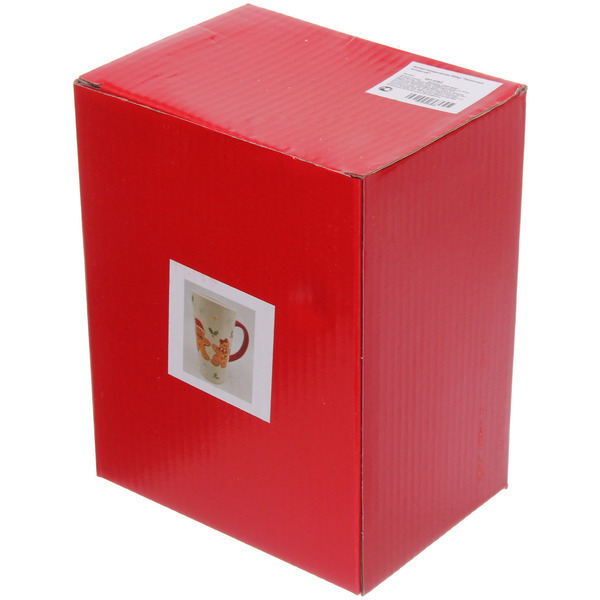 Кружка имеет цилиндрическую форму и высокий профиль, что делает ее удобной для захвата. Основной цвет кружки — белый, а ручка — ярко-красная, что добавляет ей привлекательности. Внутренняя часть кружки также белая, без узоров, что делает ее универсальной для любого стиля сервировки. Высота кружки не указана, но она выглядит крупной и вместительной, что делает ее идеальной для подачи горячих напитков.