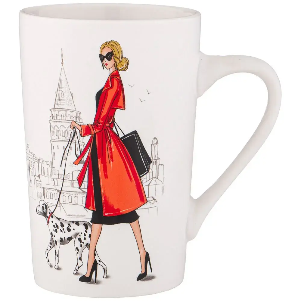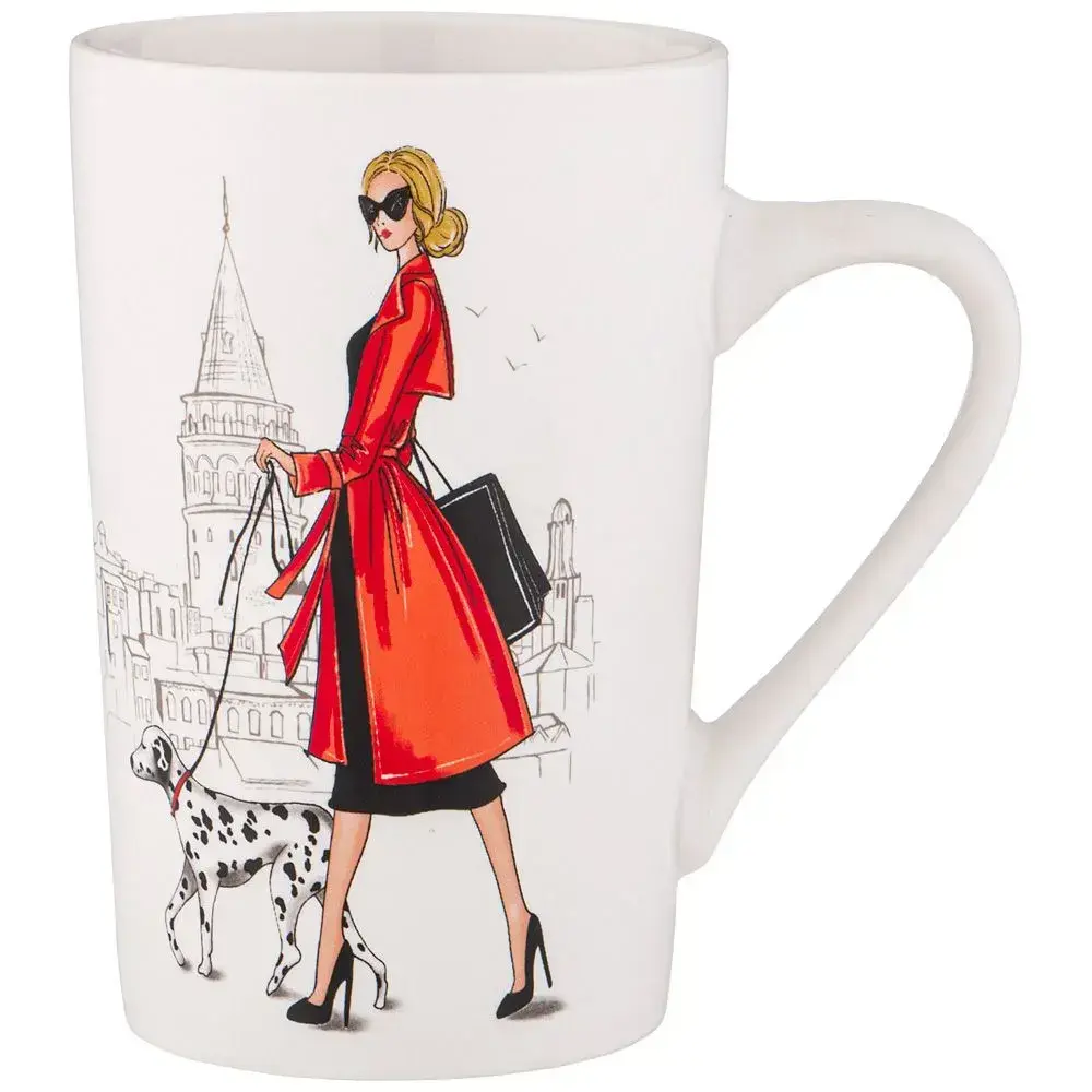 Керамическая кружка Lefard "Lady" сочетает в себе утонченный дизайн и практичность. Яркий рисунок с изображением женщины в красном пальто и собаки на фоне городского пейзажа превращает обычную посуду в элемент декора. Идеальный выбор для тех, кто ценит эстетику в повседневных мелочах.