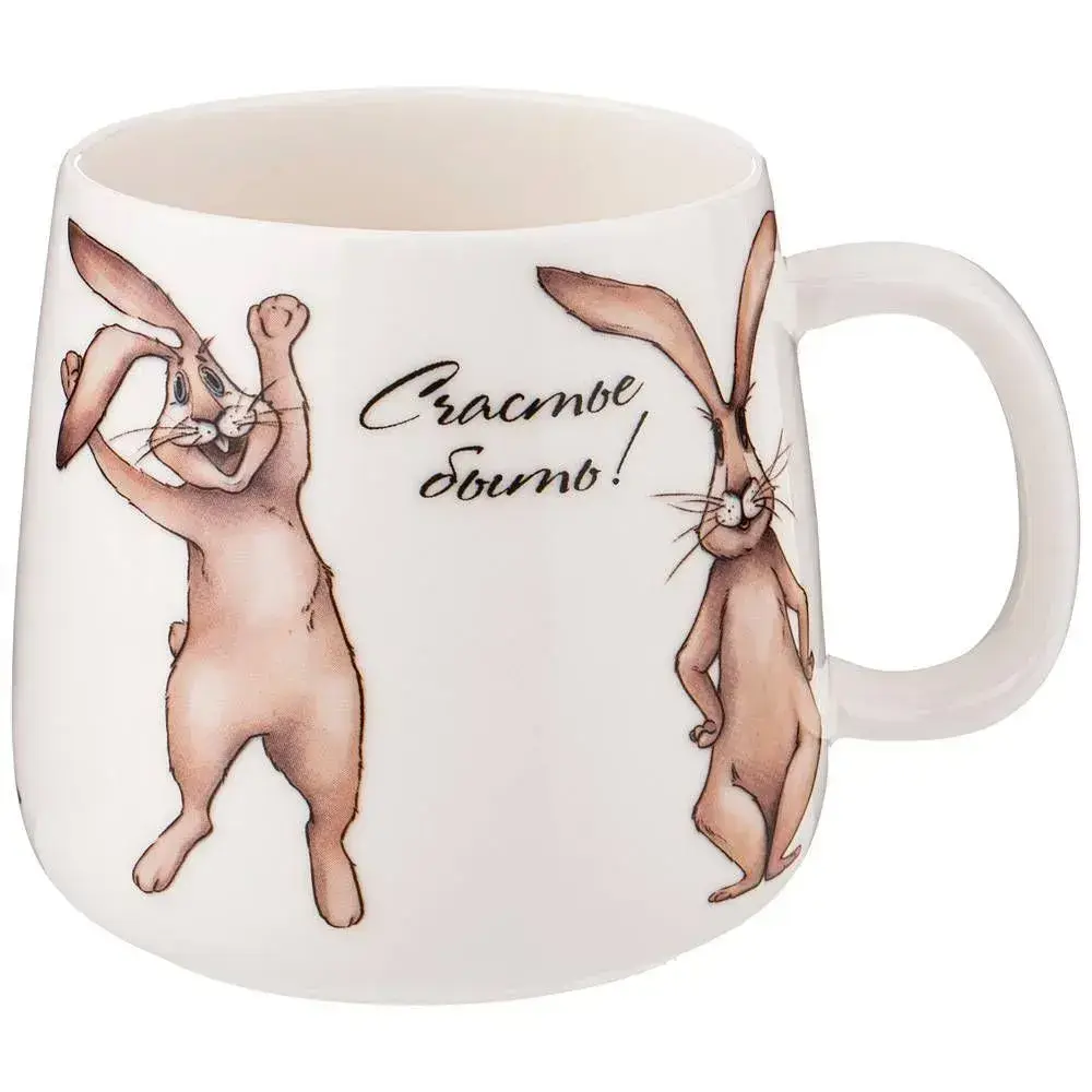 Кружка керамическая Lefard "Счастье быть!" с зайцами, 400 мл, белая, удобная ручка