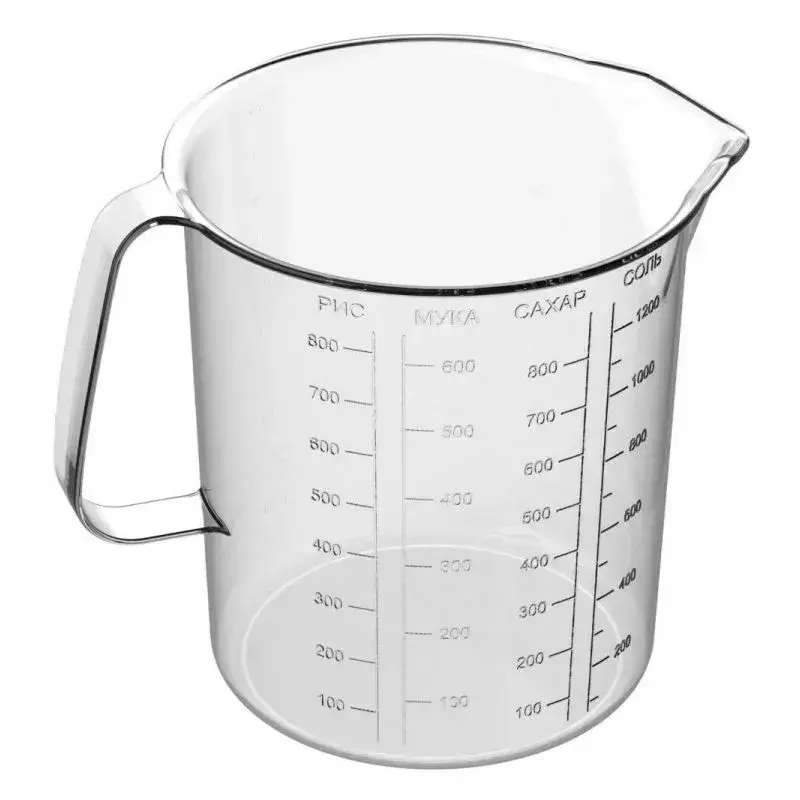 Прозрачная мерная кружка объемом 1 литр станет незаменимым помощником на кухне. Четкая шкала с разделением для муки, сахара и жидкостей позволяет быстро отмерять ингредиенты без дополнительных приборов.