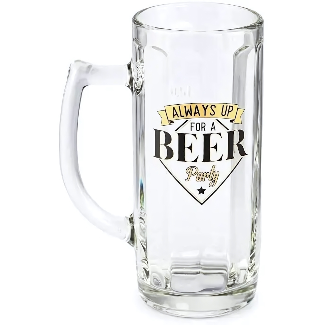 Эта стильная кружка объемом 500 мл станет вашим незаменимым спутником на вечеринках и дружеских встречах. С прозрачным стеклом и оригинальным дизайном с надписью "ALWAYS UP FOR A BEER PARTY" она не только подчеркнет вашу индивидуальность, но и создаст атмосферу праздника. Массивная ручка обеспечивает удобство при использовании, позволяя наслаждаться любимым напитком без лишних усилий.