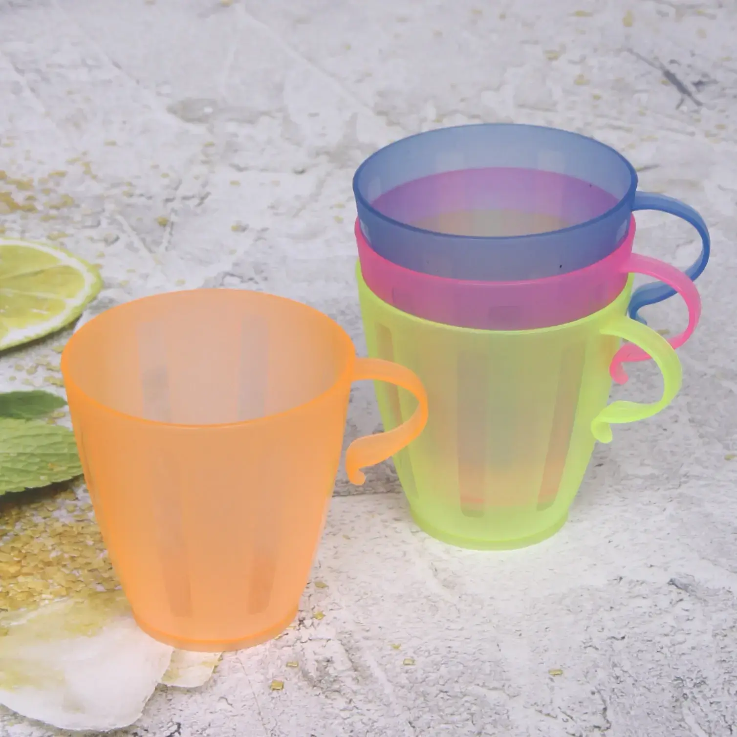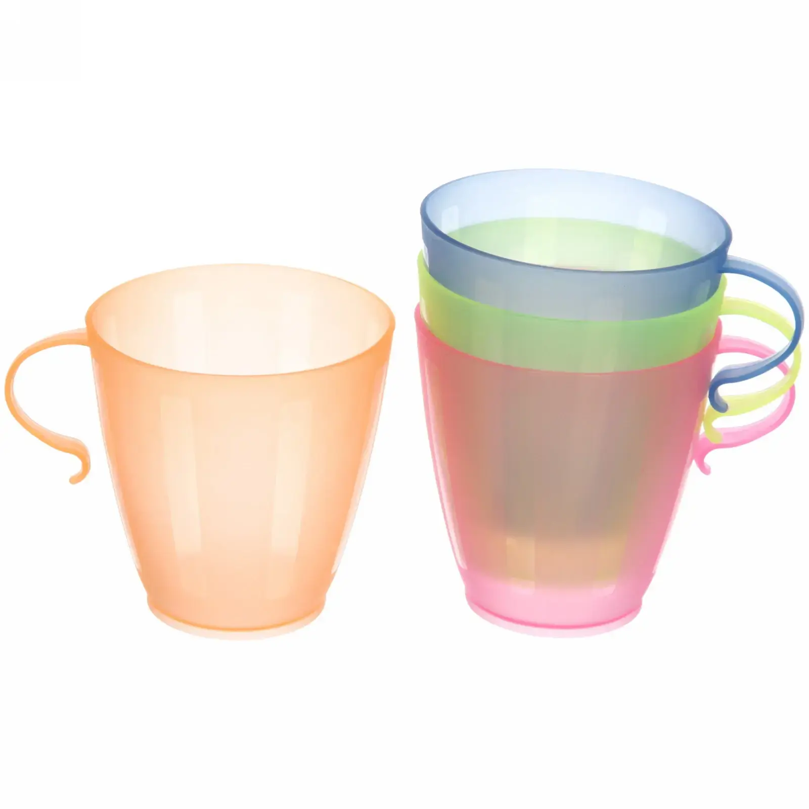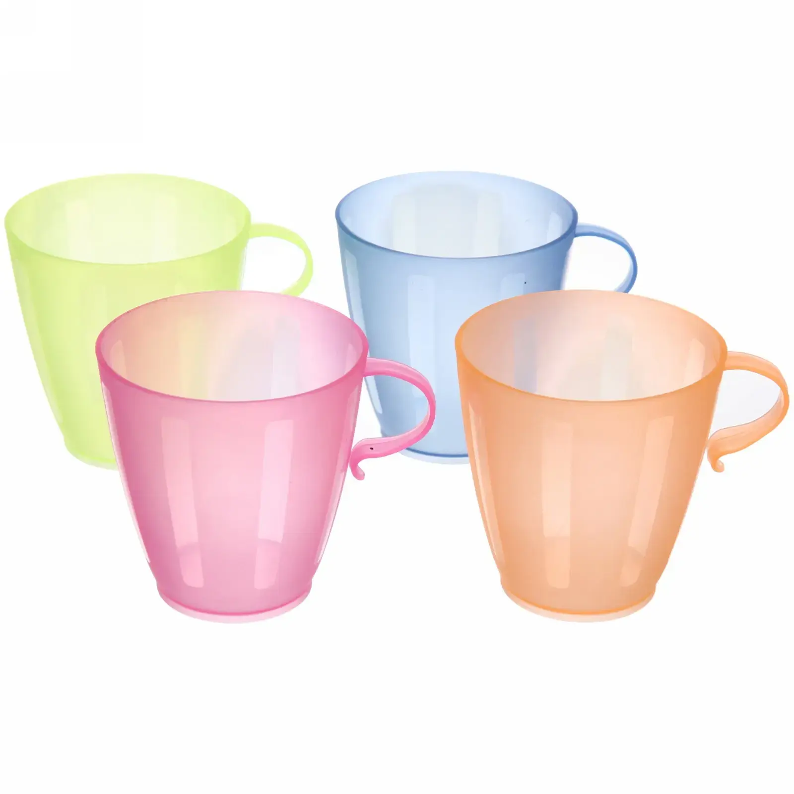 Размер каждой кружки: объем 200мл, выполнены из качественного прозрачного пластика. Набор включает четыре ярких цвета: зеленый, розовый, голубой и оранжевый.