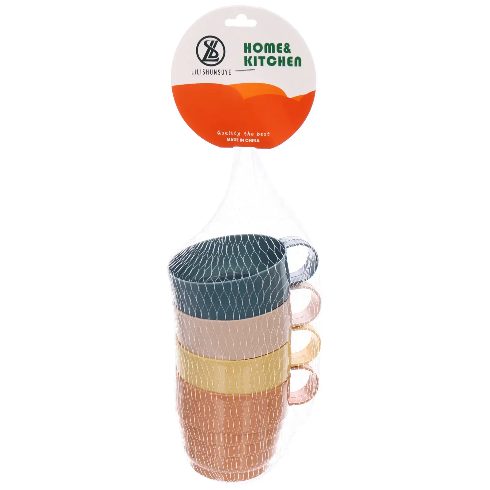 Кружки изготовлены из качественного пластика, который безопасен для здоровья и не выделяет вредных веществ. Размер каждой кружки составляет 250мл, что делает их идеальными для чая, кофе, соков и других напитков. Набор упакован в сетку, что удобно для хранения и транспортировки.
