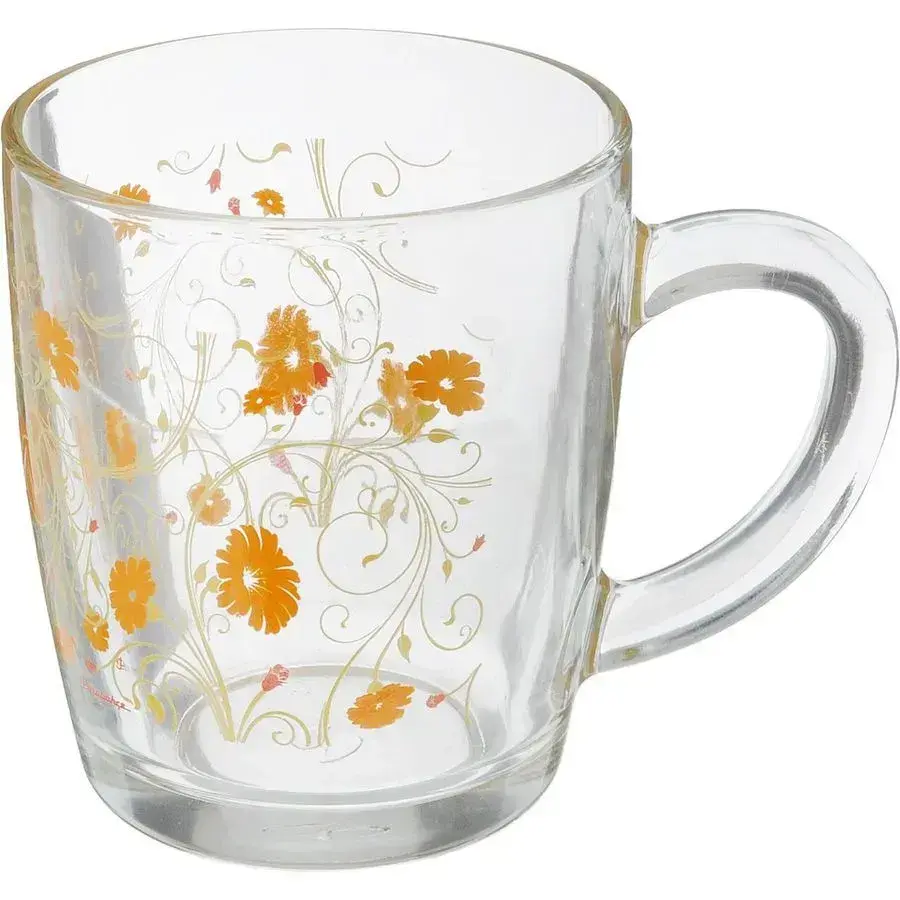 Стеклянная кружка «SERENADE» сочетает элегантный дизайн и практичность. Прозрачное стекло с золотисто-оранжевыми цветочными узорами создаёт эффект роскоши, сохраняя функциональность повседневной посуды.