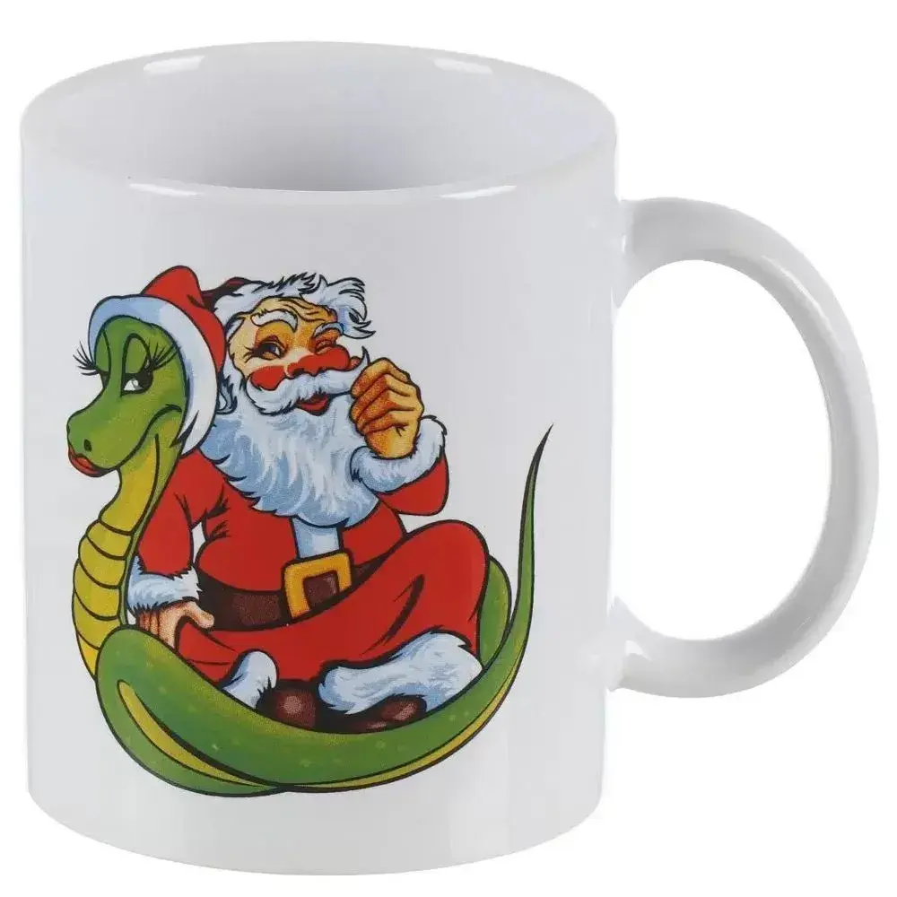 Качественная керамика обеспечивает долговечность и сохранение тепла напитка. Дизайн кружки неповторим: мультяшный Дед Мороз в ярком красном костюме и зеленая змея с симпатичным колпаком создают позитивную атмосферу. Материал устойчив к трещинам, кружка легко моется в посудомоечной машине и безопасна для здоровья. Цветной принт не выгорает со временем, сохраняя свежесть изображения.