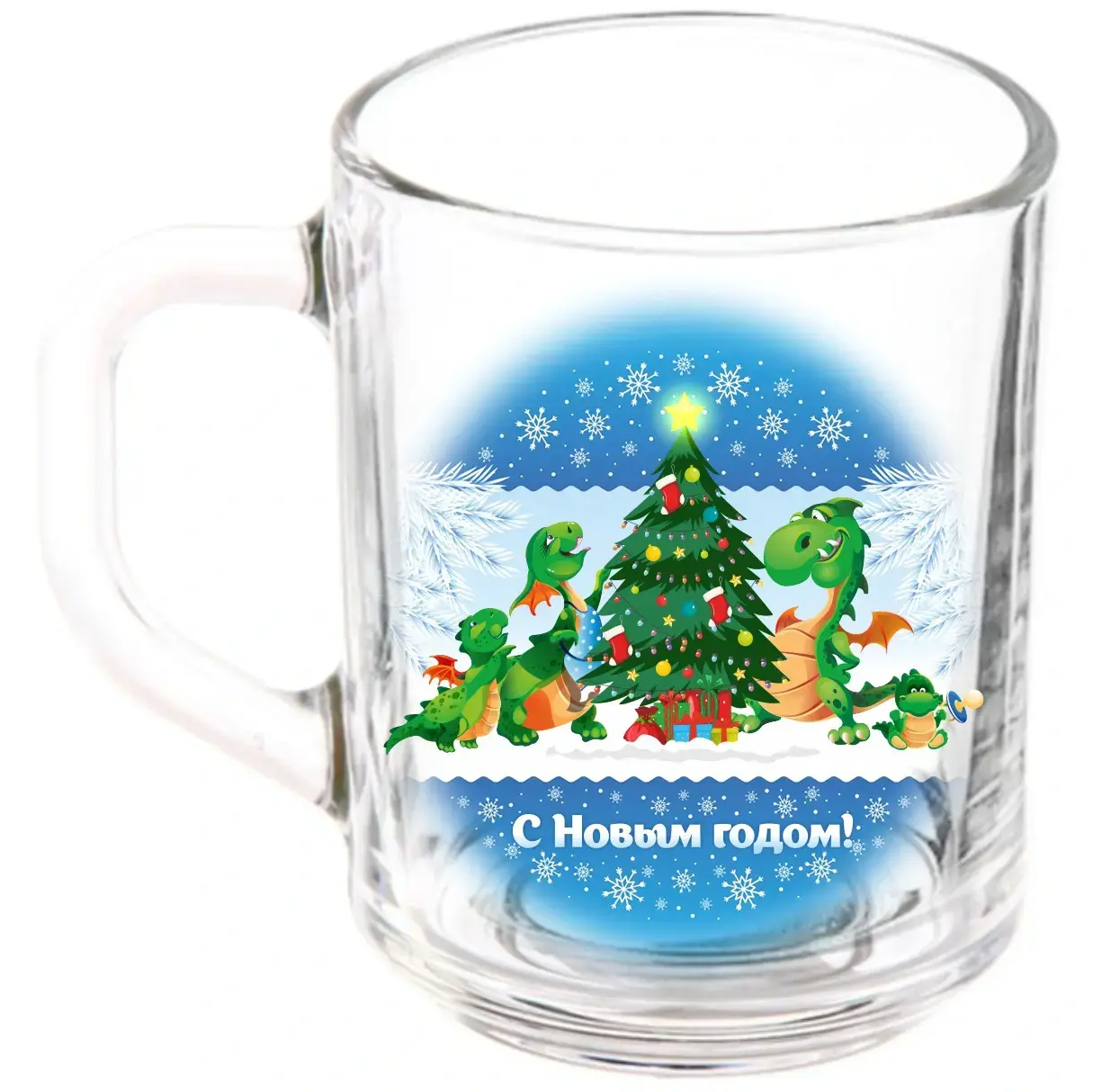 Кружка имеет стандартный размер для подобной посуды, что делает её универсальной для использования. Изготовлена из прочного стекла, что гарантирует её долговечность и устойчивость к повреждениям. Праздничный дизайн с изображением драконов и новогодней ёлки делает её отличным выбором для подарка или для создания новогоднего настроения в вашем доме.