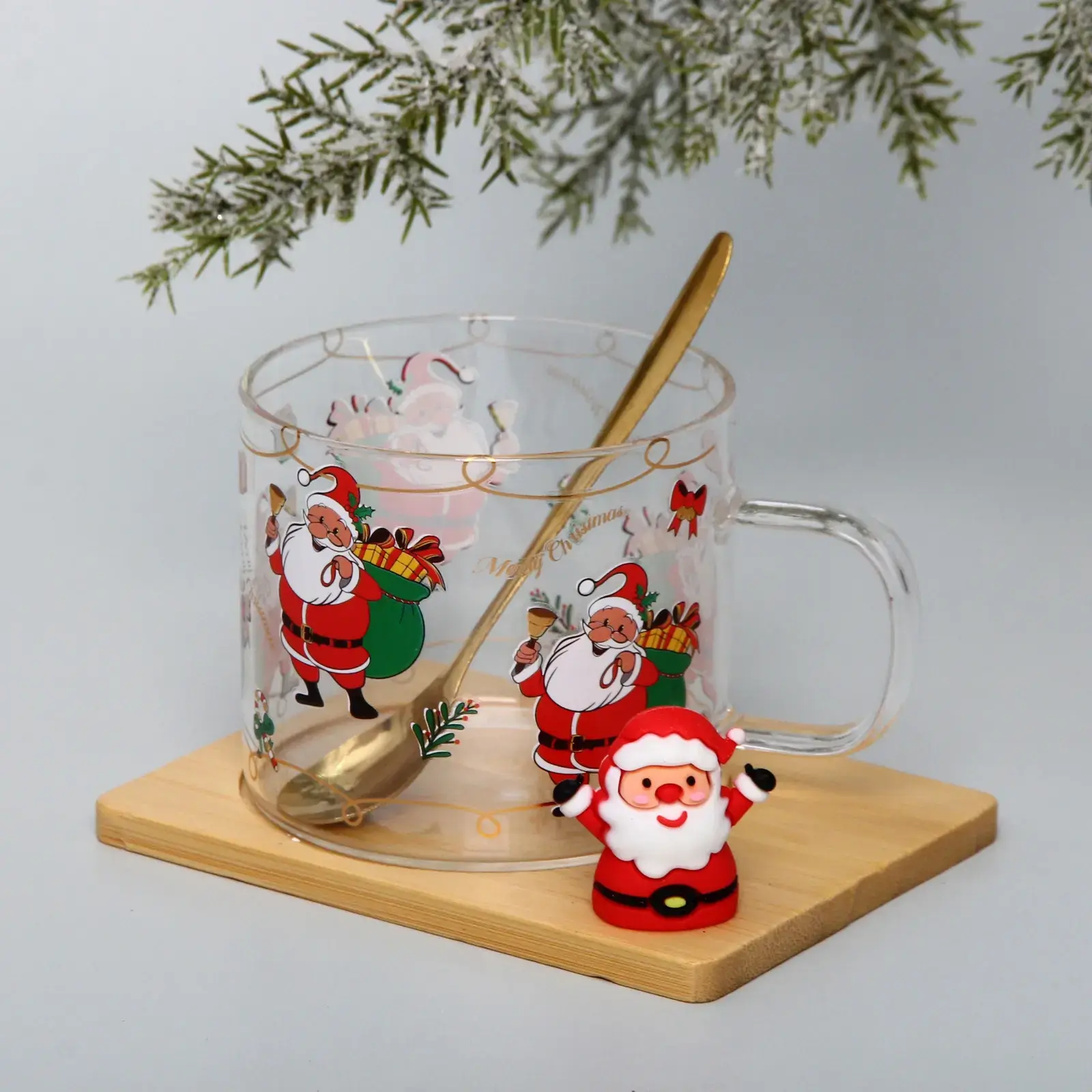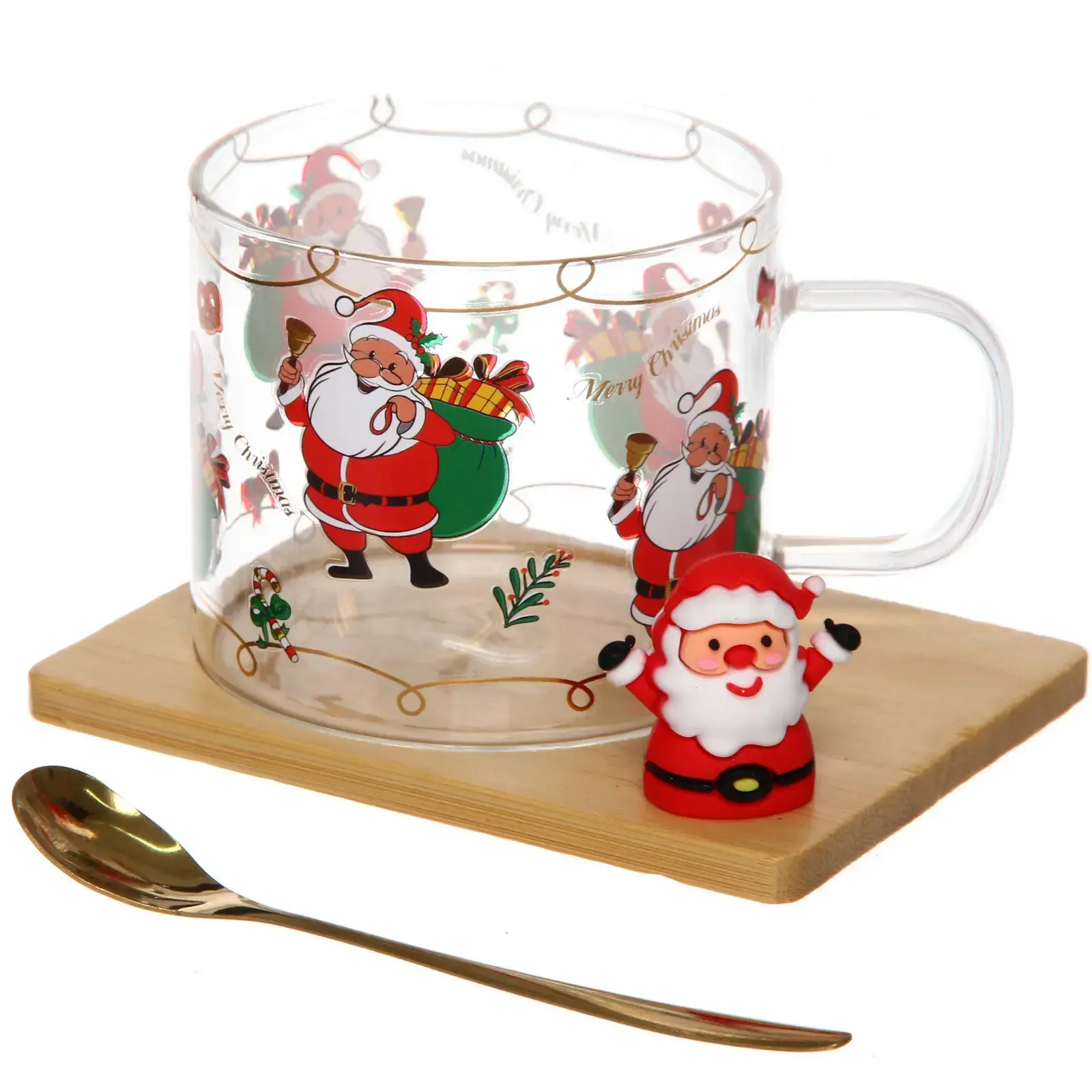 Кружка стеклянная 280мл "Дед Мороз", с ложкой и подставкой из бамбука