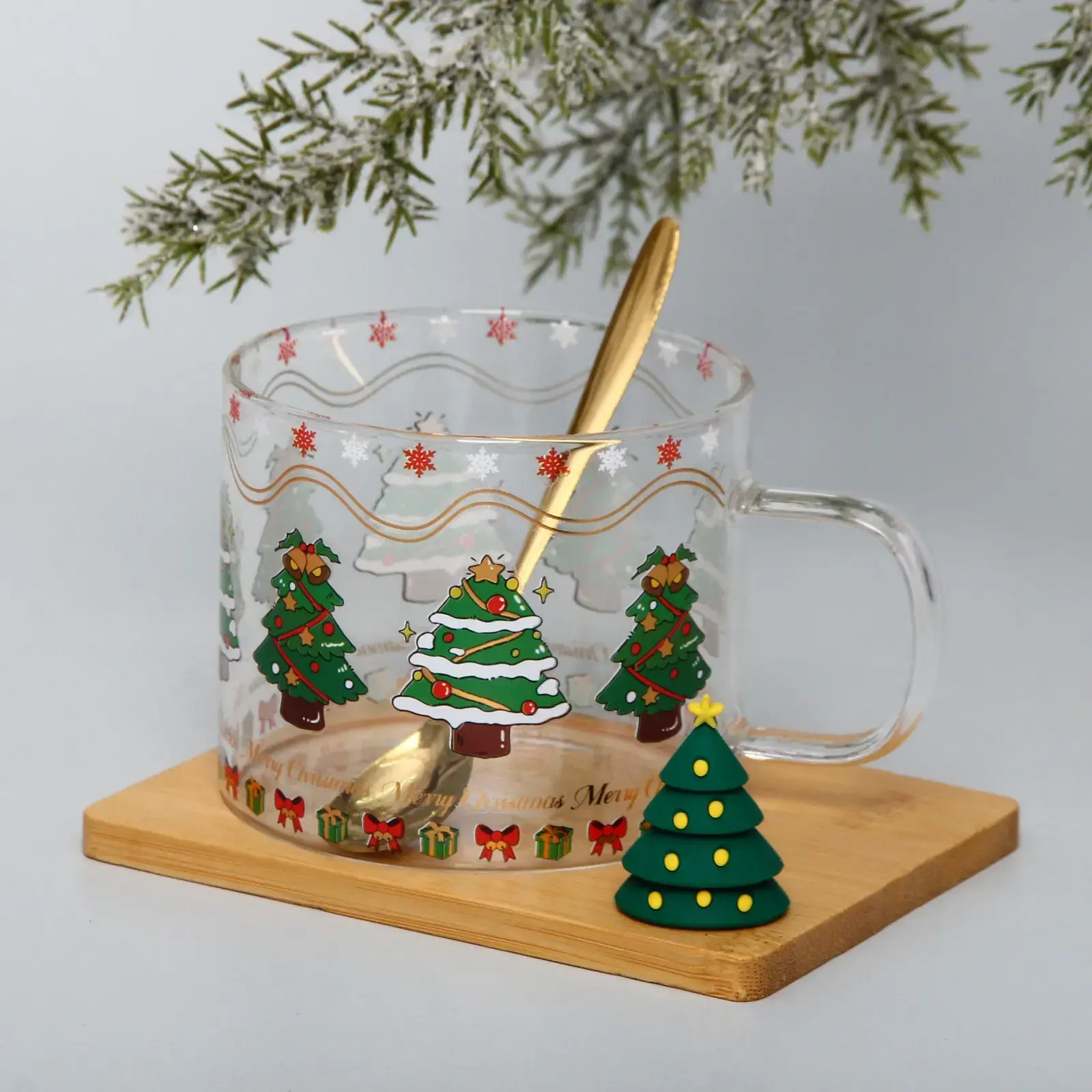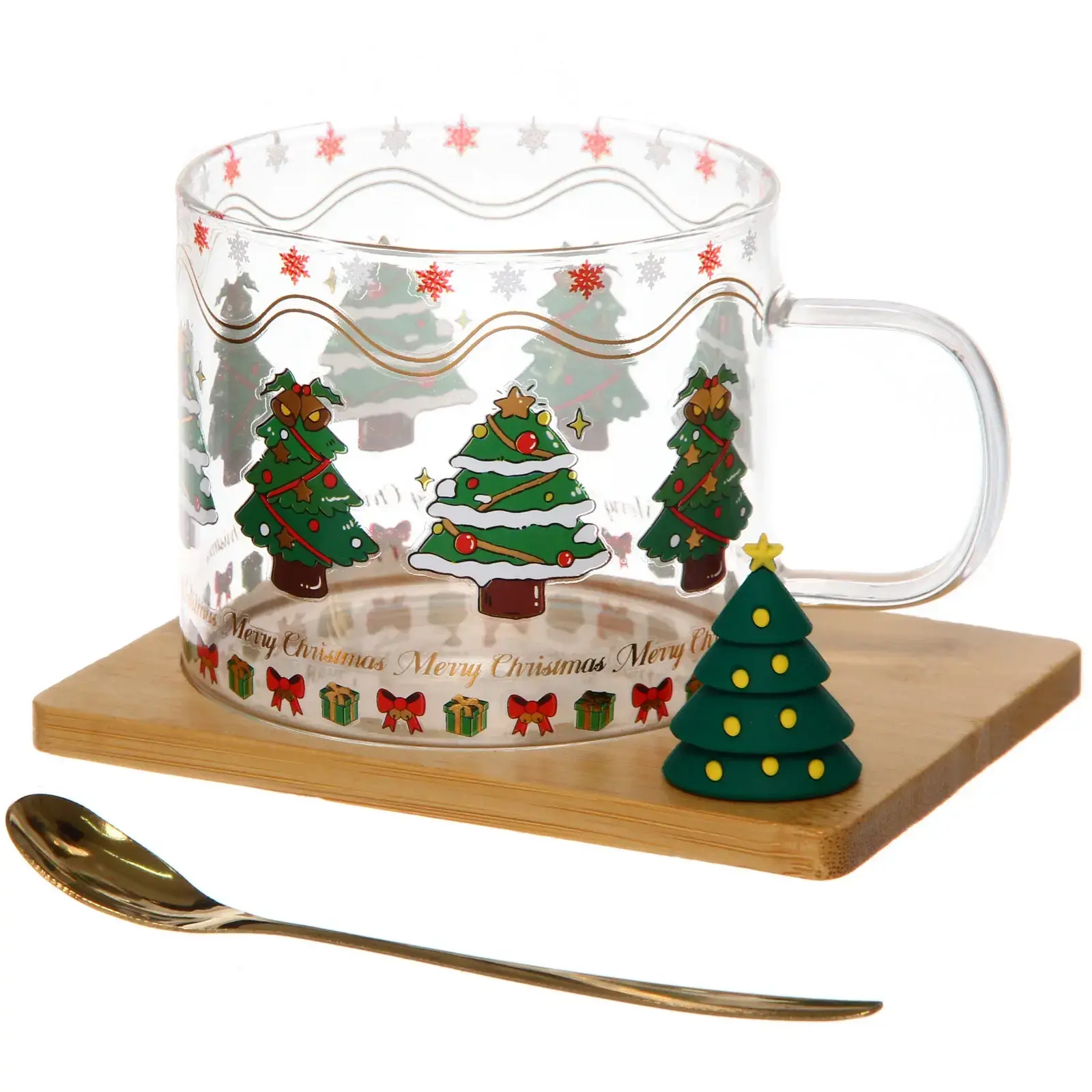 Кружка стеклянная 280мл, новогодний дизайн "Ёлочка", с ложкой и бамбуковой подставкой