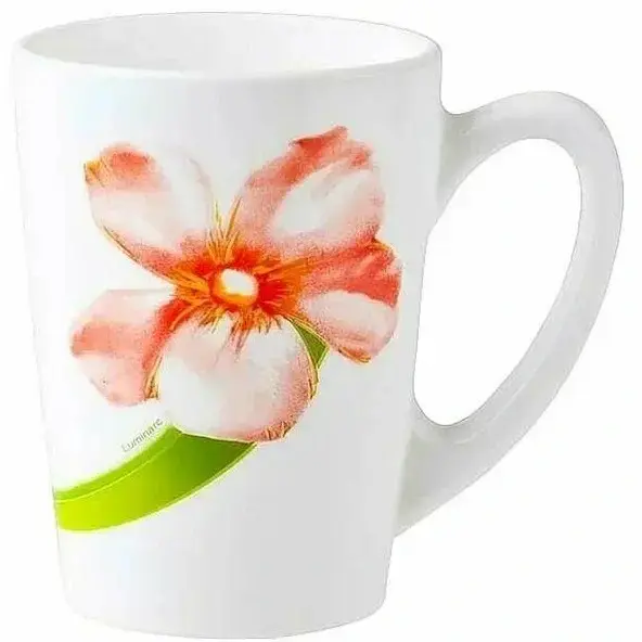 Кружка объёмом 320 мл выполнена из стекла белого цвета с рисунком цветка, сочетающего розовые, оранжевые и зелёные оттенки. Ручка удобной формы расположена справа. Отгружается один товар, цвет и декор соответствуют описанию.