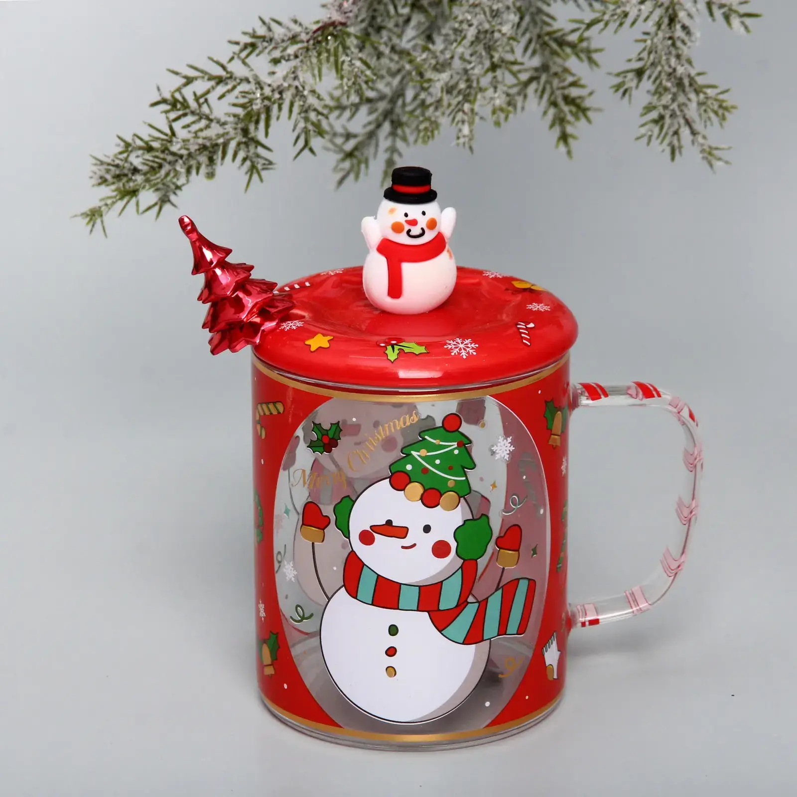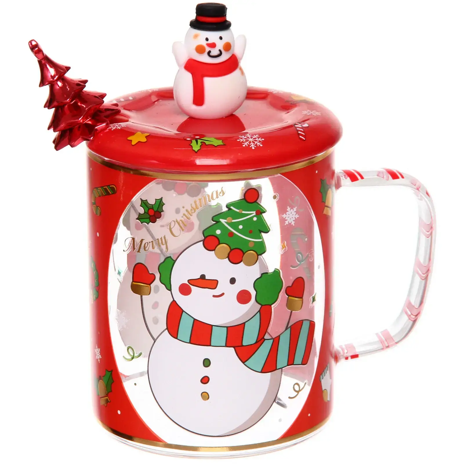 Кружка стеклянная 400мл "Забавные Снеговики", с крышкой и ложкой, цвет в ассортименте