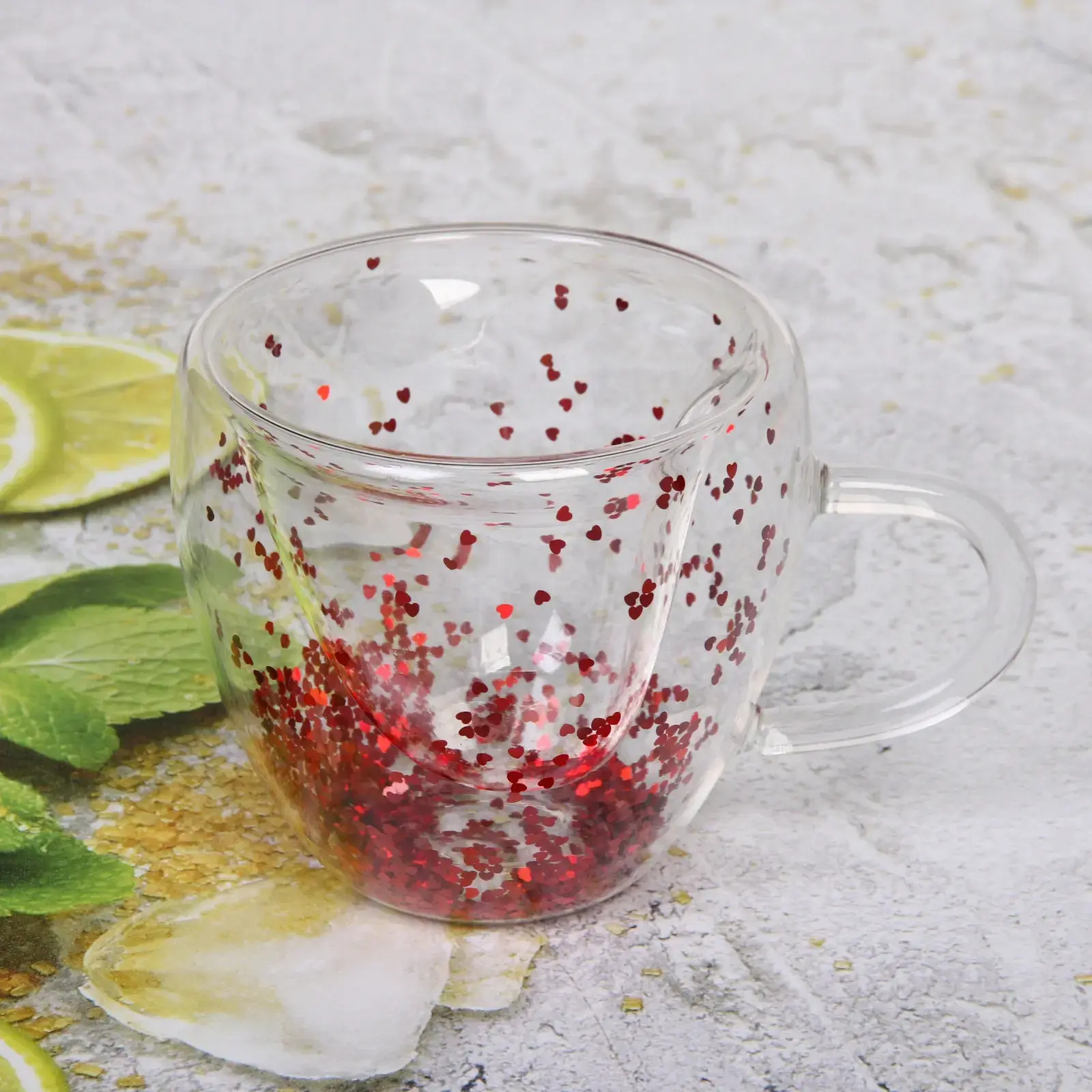 Подарите себе и своим близким уют и радость с этой уникальной кружкой, которая станет не только функциональным предметом, но и стильным элементом декора. Кружка с двойными стенками сохраняет тепло ваших любимых напитков, а блестки в форме сердечек добавляют романтики и праздничного настроения.