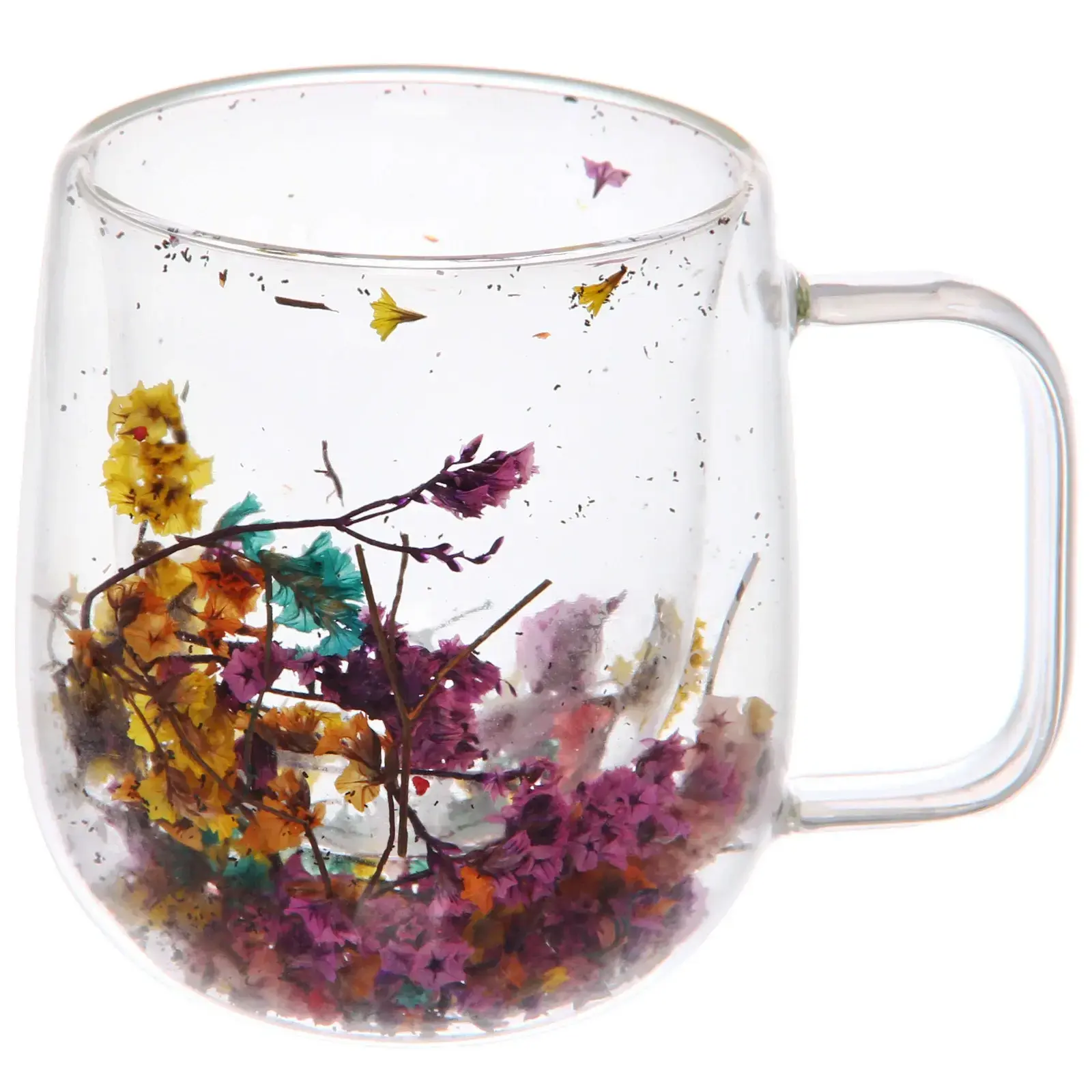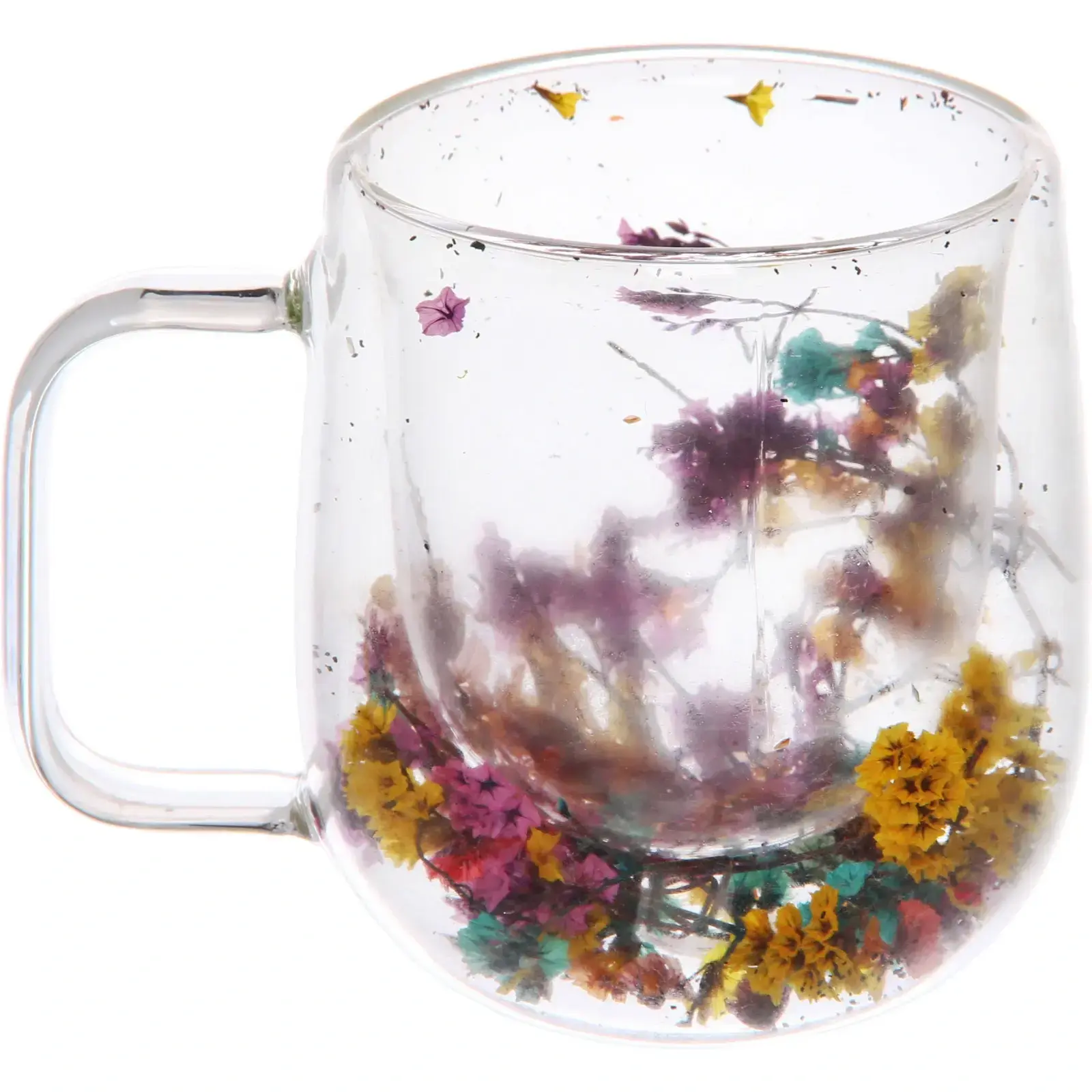 Стеклянная кружка 'Хай-Тек' с изысканными засушенными цветами создает неповторимую атмосферу и привносит эстетику в вашу повседневность.