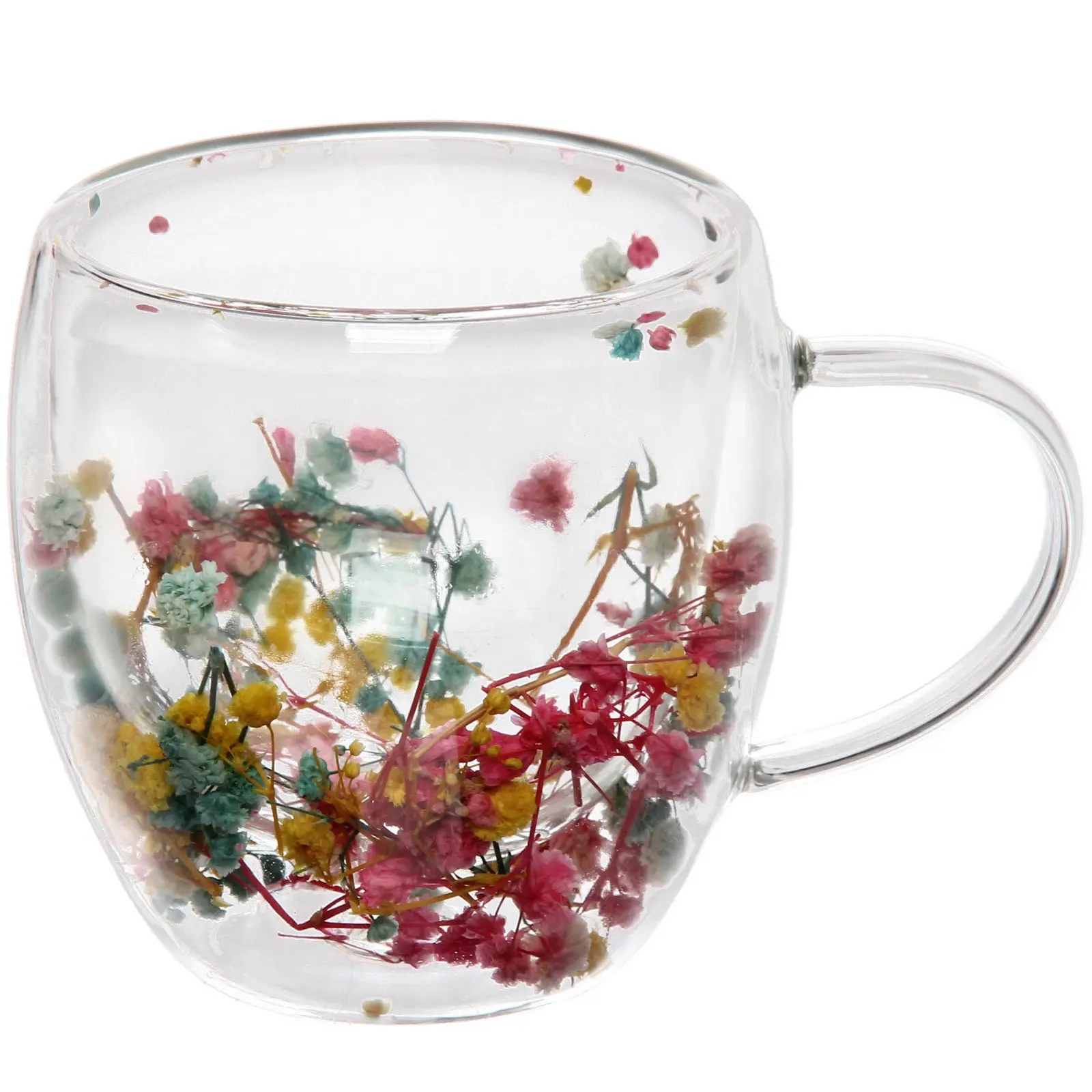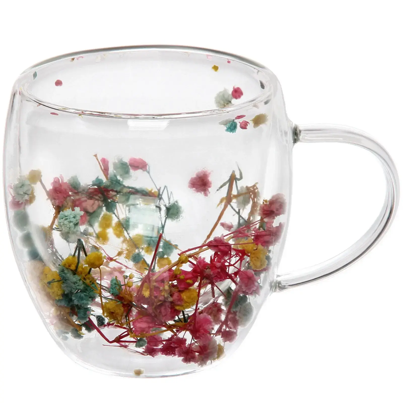 Боросиликатное стекло устойчиво к перепадам температур и механическим повреждениям. Встроенные засушенные цветы создают неповторимый декоративный эффект, делая каждое чаепитие особенным.