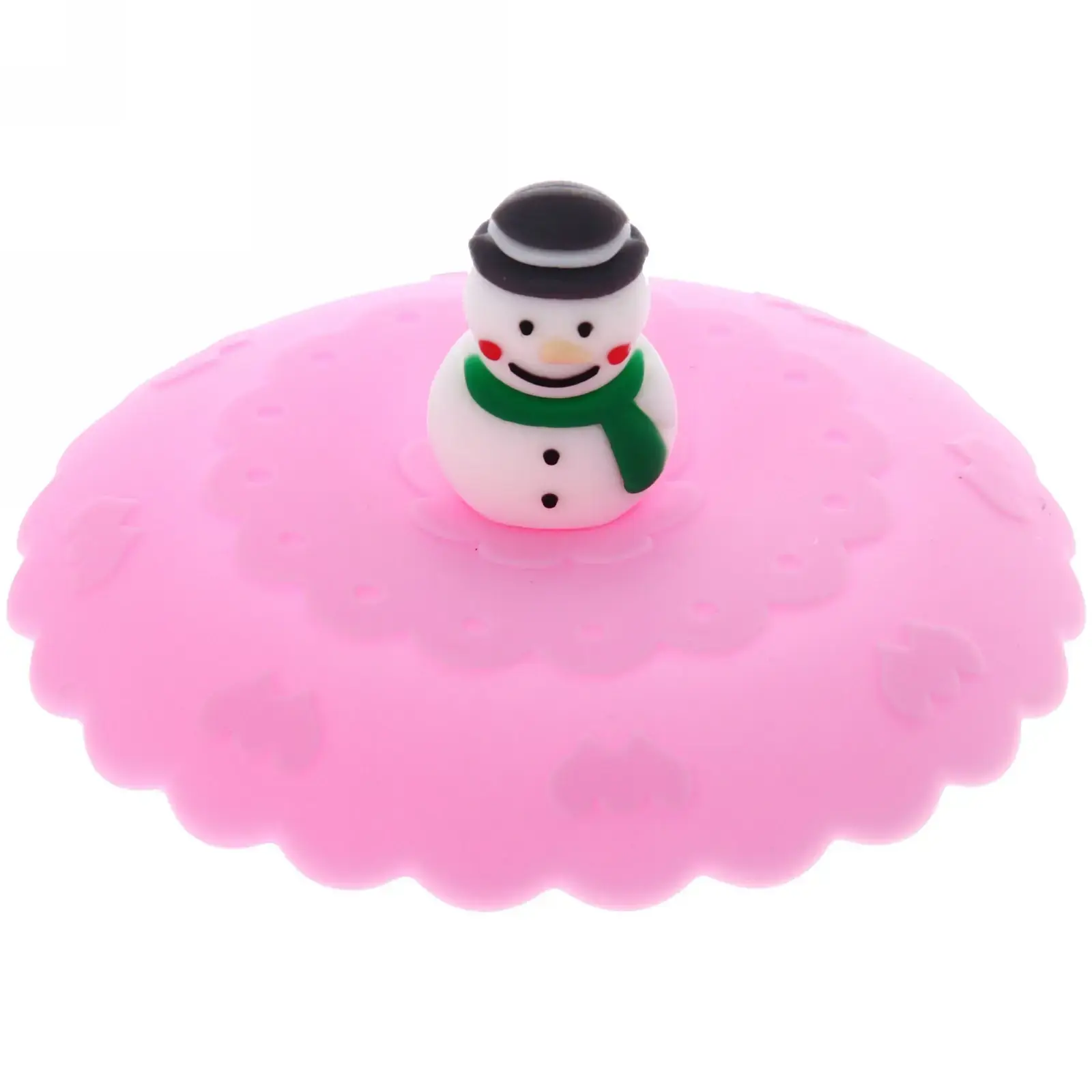 Крышка имеет розовый цвет и украшена фигуркой снеговика с черной шляпой и зеленым шарфом. Ее размеры составляют 10 см в диаметре, что позволяет использовать ее с большинством стандартных кружек. Силиконовая крышка не только практична, но и добавляет яркий акцент на вашем столе.