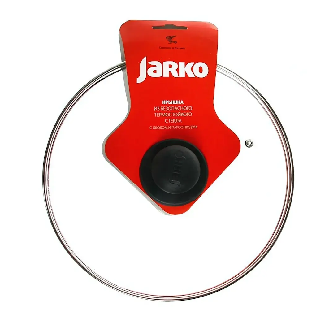 Крышка идеально подходит для различных типов посуды, позволяя вам готовить любимые блюда с максимальным комфортом. Она легко устанавливается на кастрюли и сковороды, обеспечивая надежное прилегание. Черная пластиковая ручка с логотипом JARKO не только стильная, но и удобная, что делает процесс готовки еще более приятным.