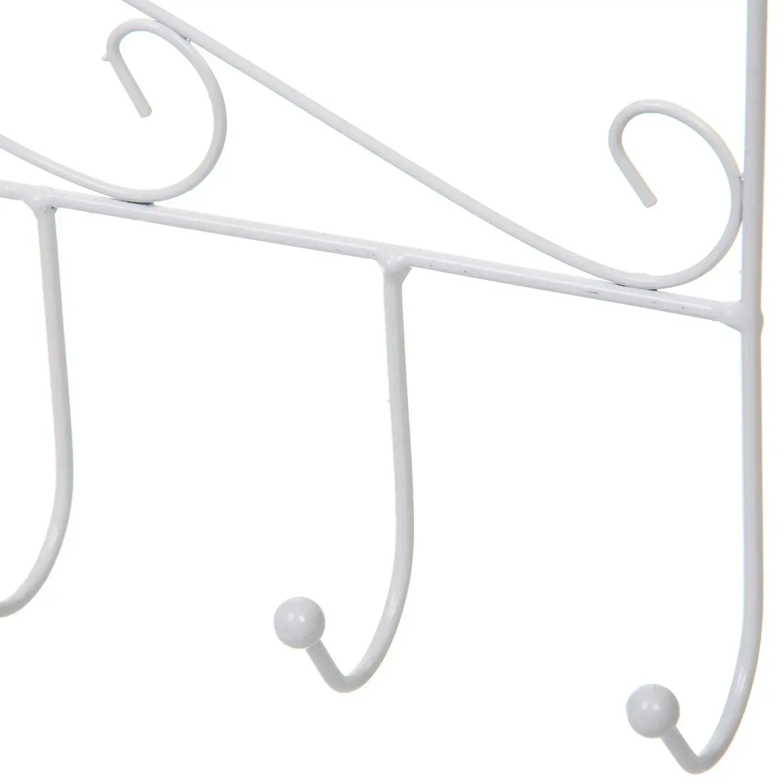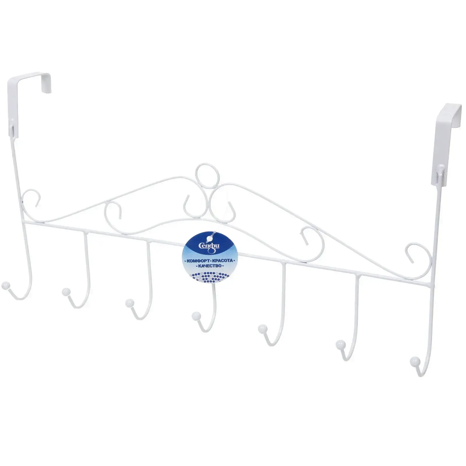 Крючки выполнены из прочного металлического материала, что гарантирует их долговечность и надежность. Каждый из шести крючков заканчивается шарикоподобной деталью, что предотвращает соскальзывание одежды. Изогнутая форма вешалки добавляет ей декоративный элемент, делая её не только функциональной, но и стильной.