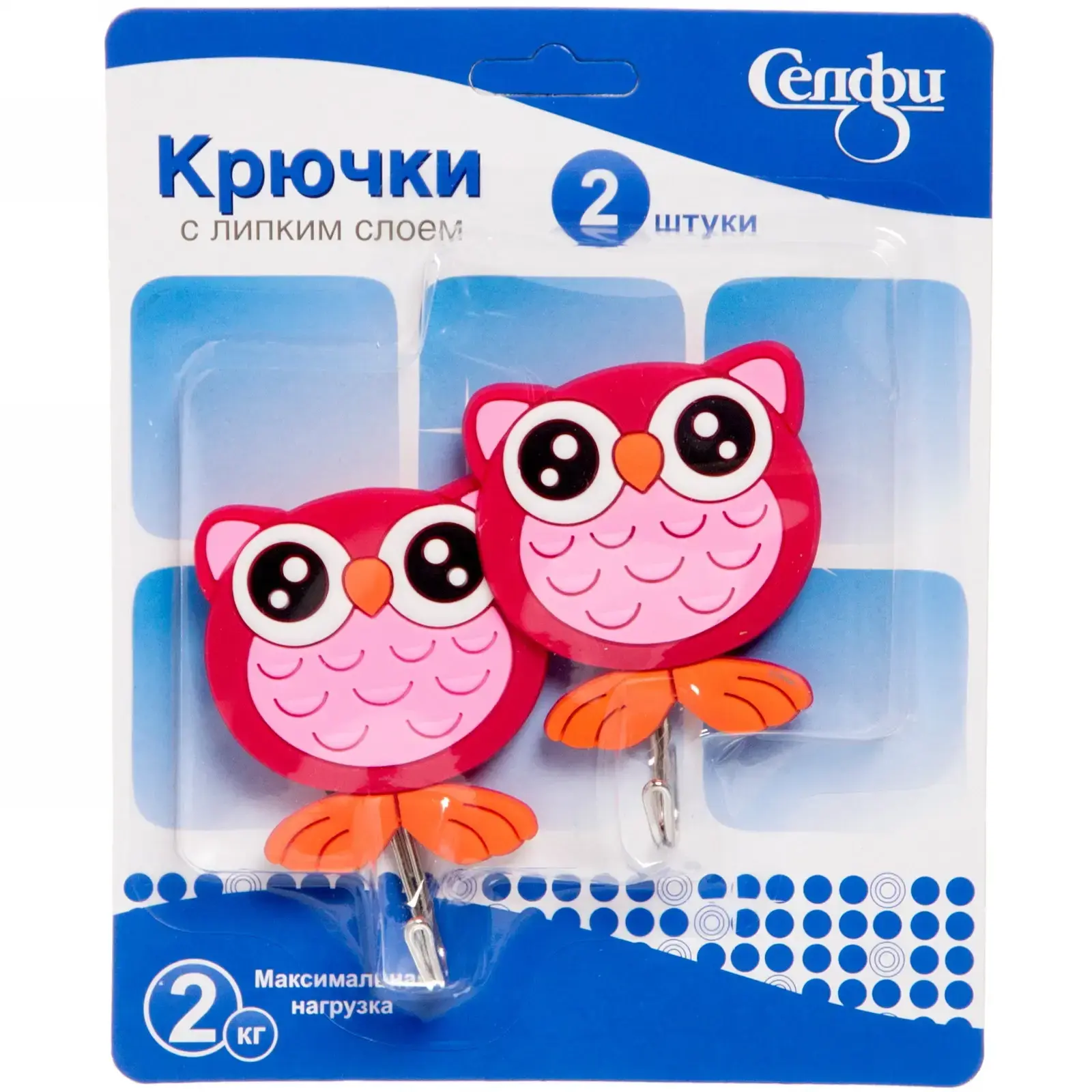 Крючок настенный с липким слоем, сова, 2 шт, розовый, выдерживает до 2 кг, пластик/металл, для гладких поверхностей