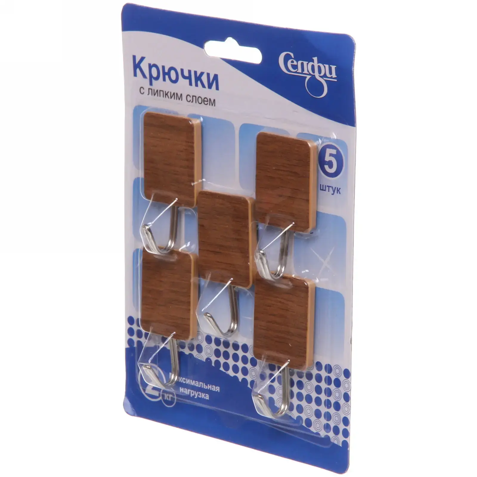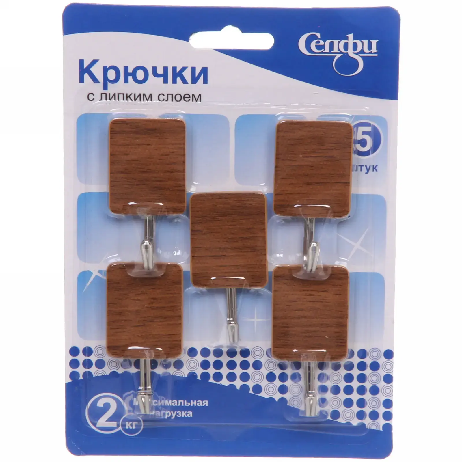 Крючки имеют прямоугольную форму и выполнены в цвете тёмного дерева, что делает их стильным дополнением к любому интерьеру. Они легко крепятся на вертикальные поверхности благодаря самоклеящемуся слою. Просто очистите поверхность, удалите защитный слой и прикрепите крючок, прижав его на 30 секунд. Максимальная нагрузка на каждый крючок составляет 2 кг, что позволяет использовать их для различных целей.